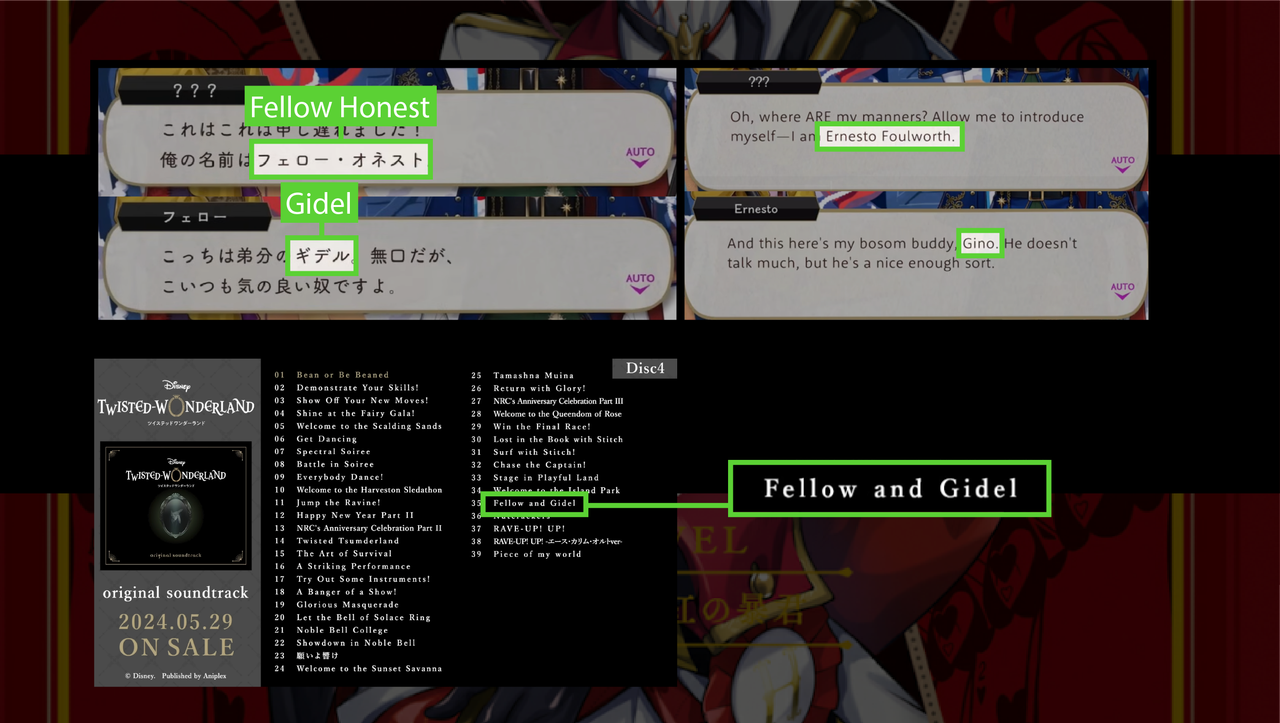 But even if a spelling is revealed by an official JP source it might still not match the English-language localization, much like how the spelling of the name “Fellow” was confirmed on the official soundtrack, but still changed for EN.
