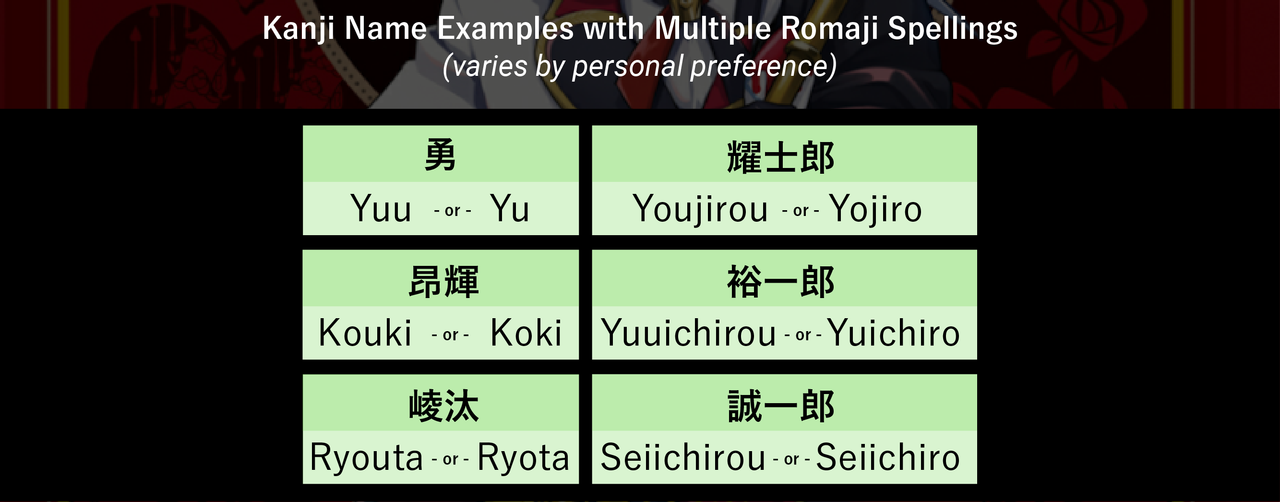 It’s possible to use a variation based on personal preference, and when applying for a passport you can choose the romaji spelling for your name (such as “Yuuken” or “Yuken” for “雄剣”).