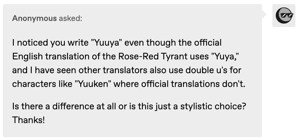 So is writing “Yuken” with one “u” incorrect? Until such a time that Yana or another official JP source confirms, then both are possibilities.