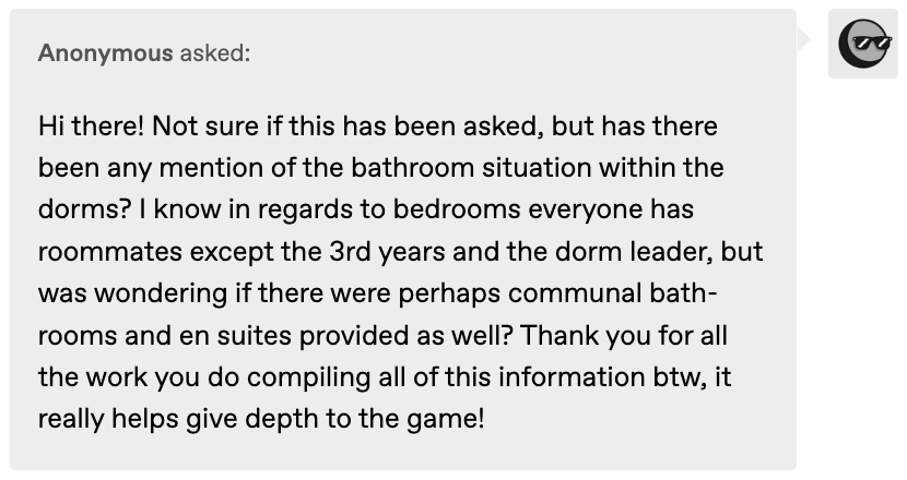 It has since been confirmed in Vil’s vignette that housewardens also do not have private baths/sinks, or at least that is the situation at Pomefiore? No word yet from other housewardens.