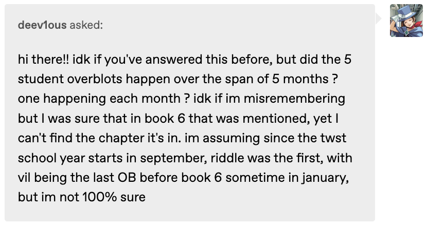 It may be difficult to prove that overblots have canonically been happening at a pace of exactly once a month, but in Book 6 we learn from Idia that there have been five overblots “in less than six months,” which he says on the same day as he overblots himself.