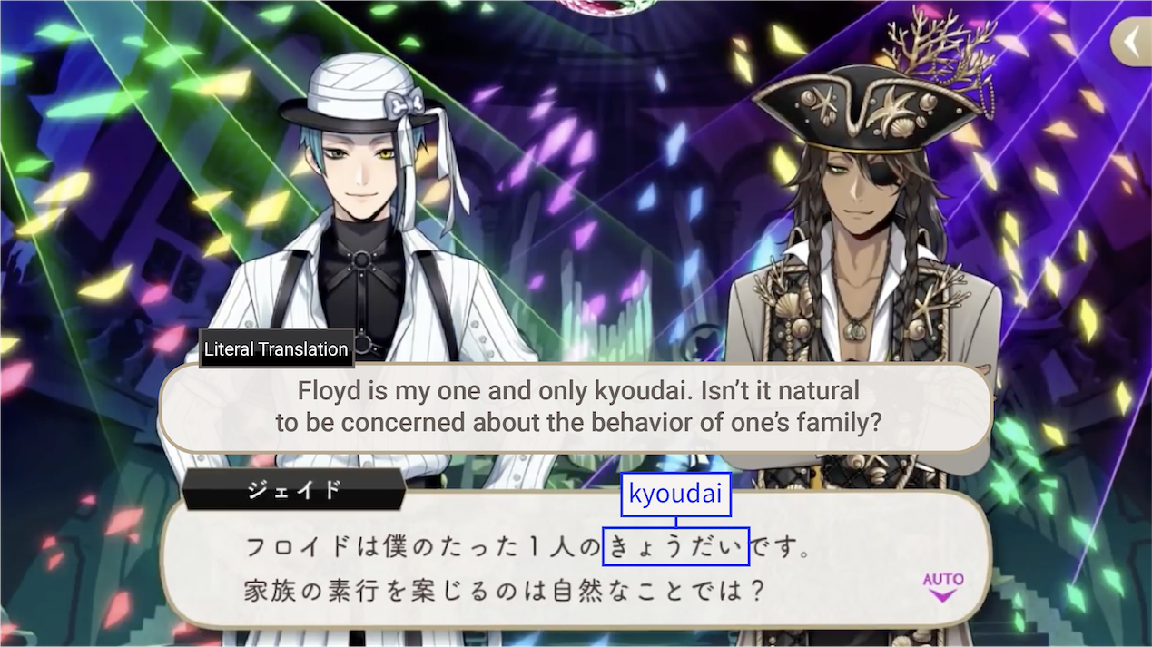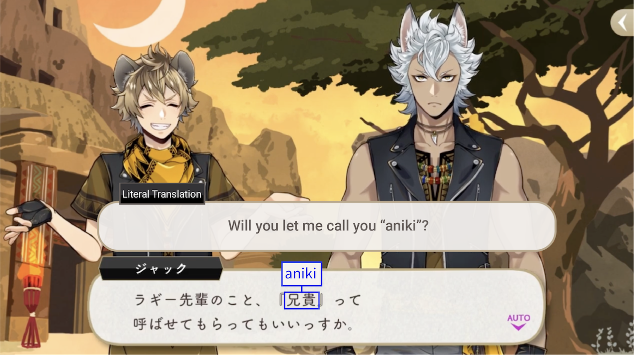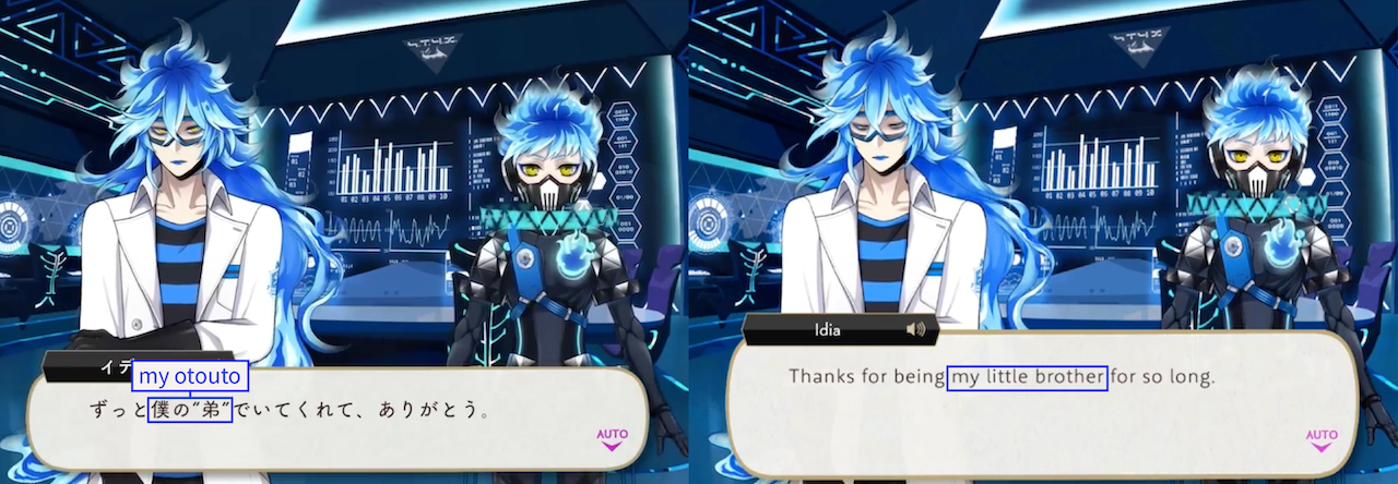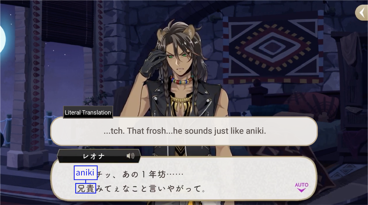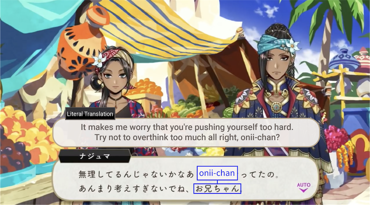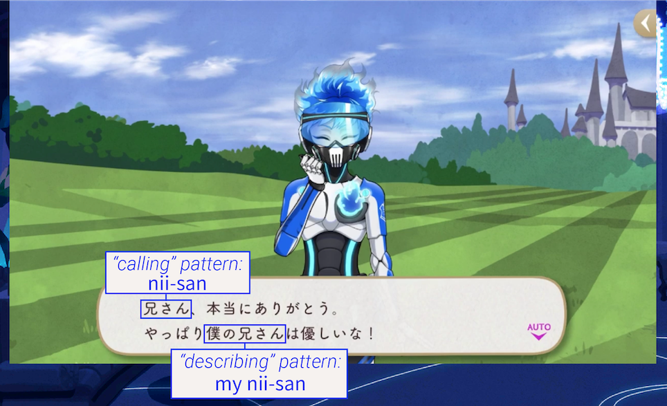 Other examples in the game of the “calling” pattern are Najma and Leona, who use “onii-chan” and “aniki” (respectively) for their older brothers in sentences that would, in English, exchange those words for their siblings’ names.