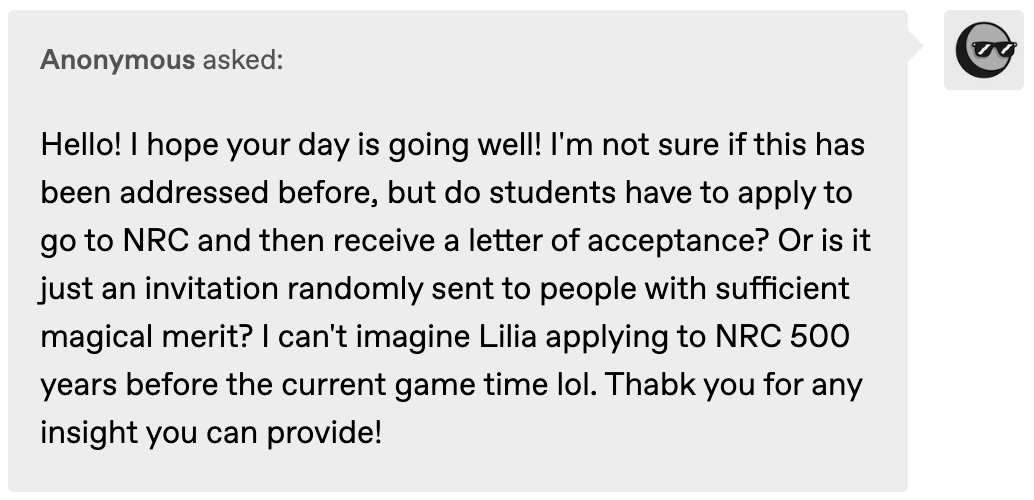 It seems like these achievements would have influenced their selection by the Dark Mirror, except: they both attend NRC alongside students like Ruggie, who describes himself as “a middling mage.”