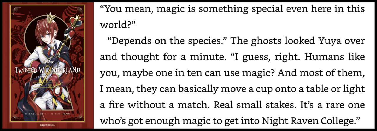 According to the novel magic is special even in the Twst universe, with a ghost explaining to Yuuya that only one in ten humans can can use any magic at all, and that is usually “real small stakes” magic like the ability to move a cup onto a table or light a fire without a match.