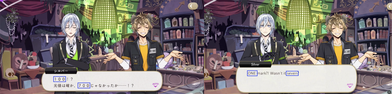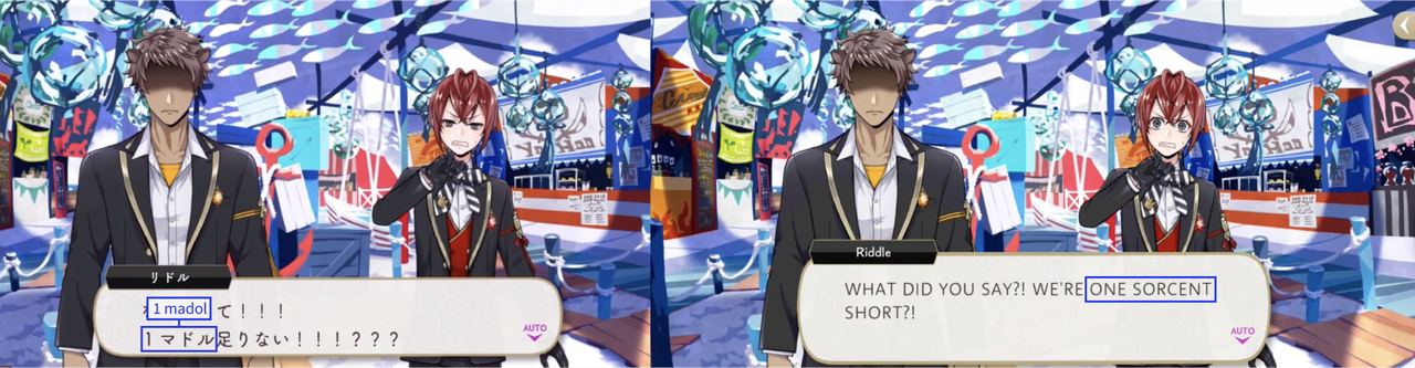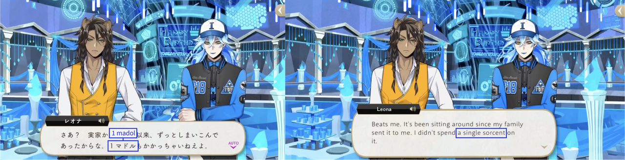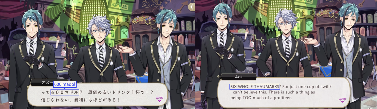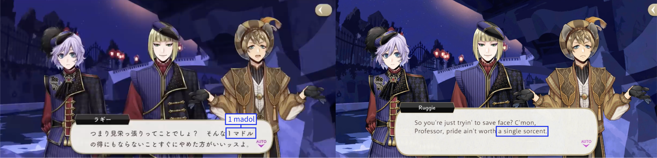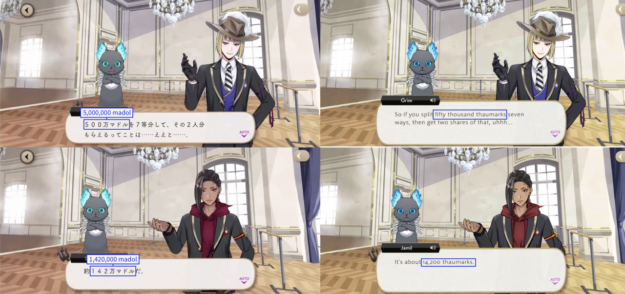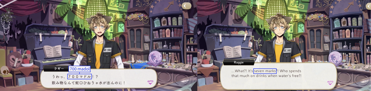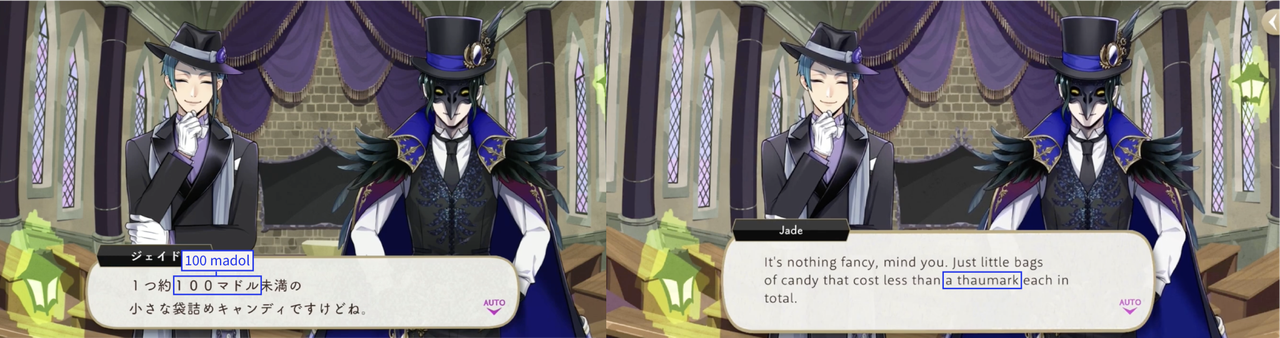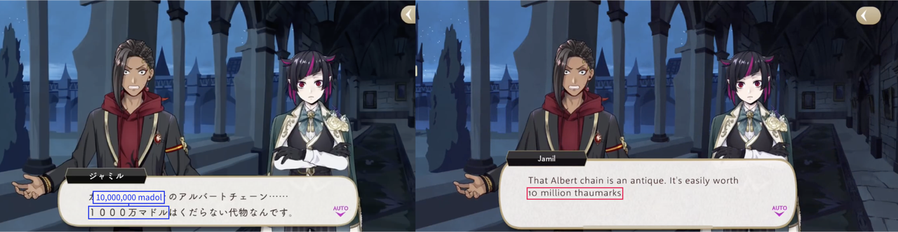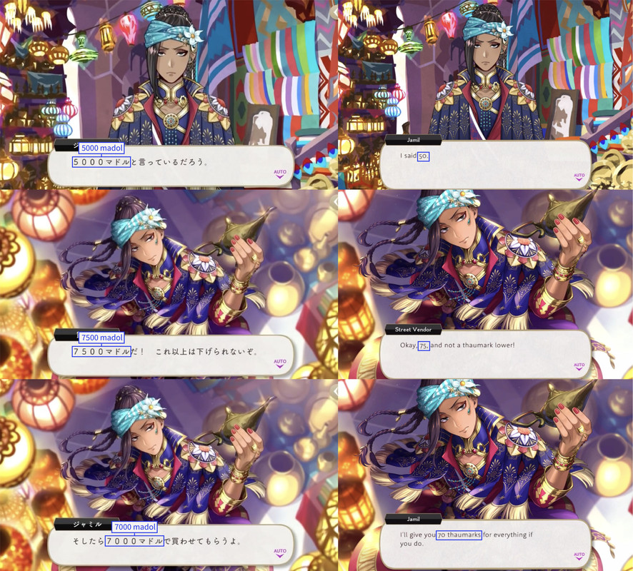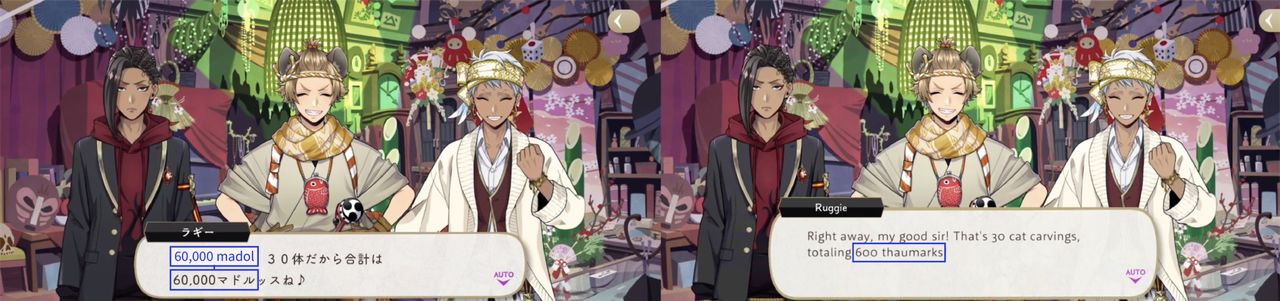 This change over from yen to USD resulted in a challenge for Aniplex USA: sometimes characters will say that something costs 1 madol, which is 0.01 thaumarks. As 1 madol = 1 yen (1 cent USD) this is something the original game can do with madols, but EN cannot do with thaumarks.