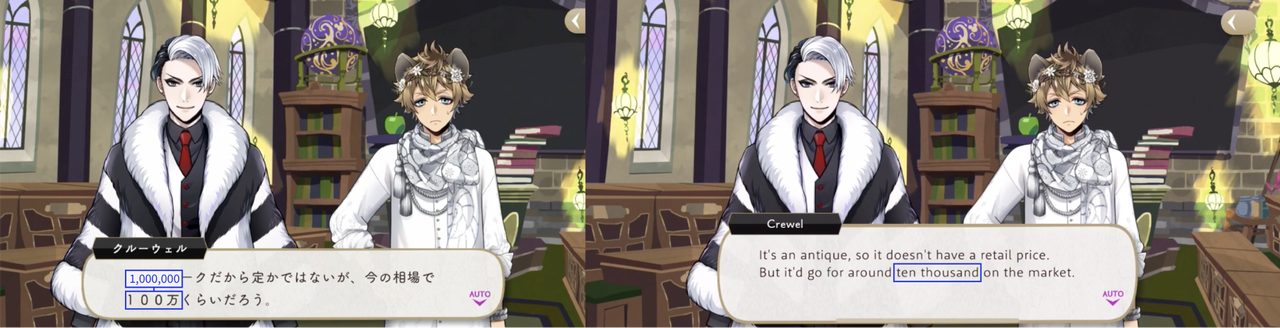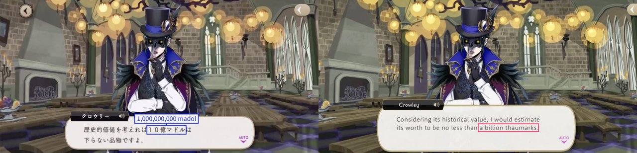 And in the Prologue the chandelier is 1 billion madol/yen, so it should be only 10 million thaumarks/USD, but was translated literally as “1 billion thaumarks,” instead.