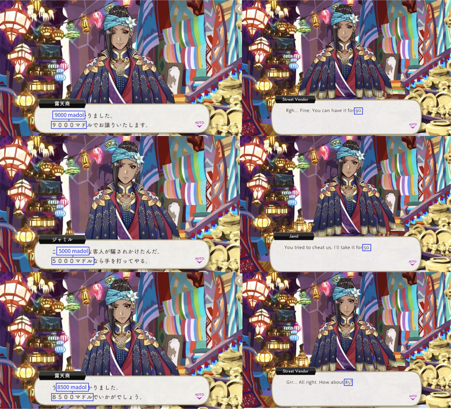 Jamil haggles for a lamp during Firelit Sky, getting it down from 10,000 madol/yen (100 thaumarks/USD) to 7,000 madol/yen (70 thaumarks/USD).