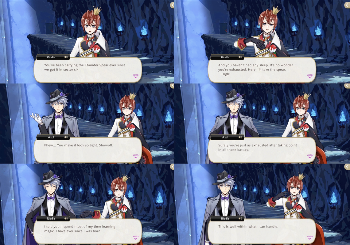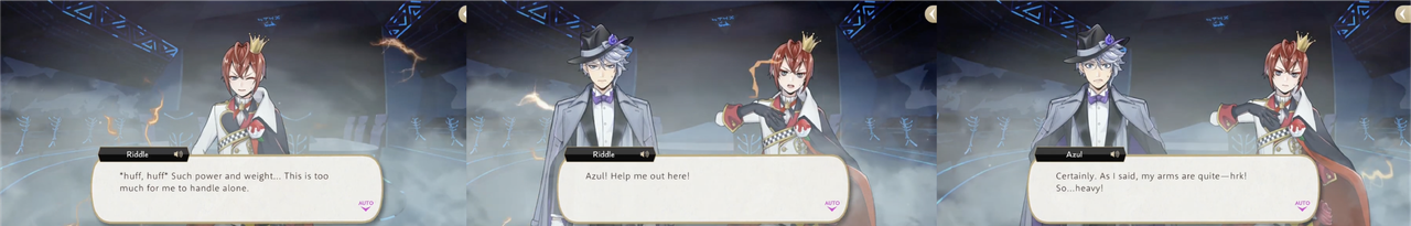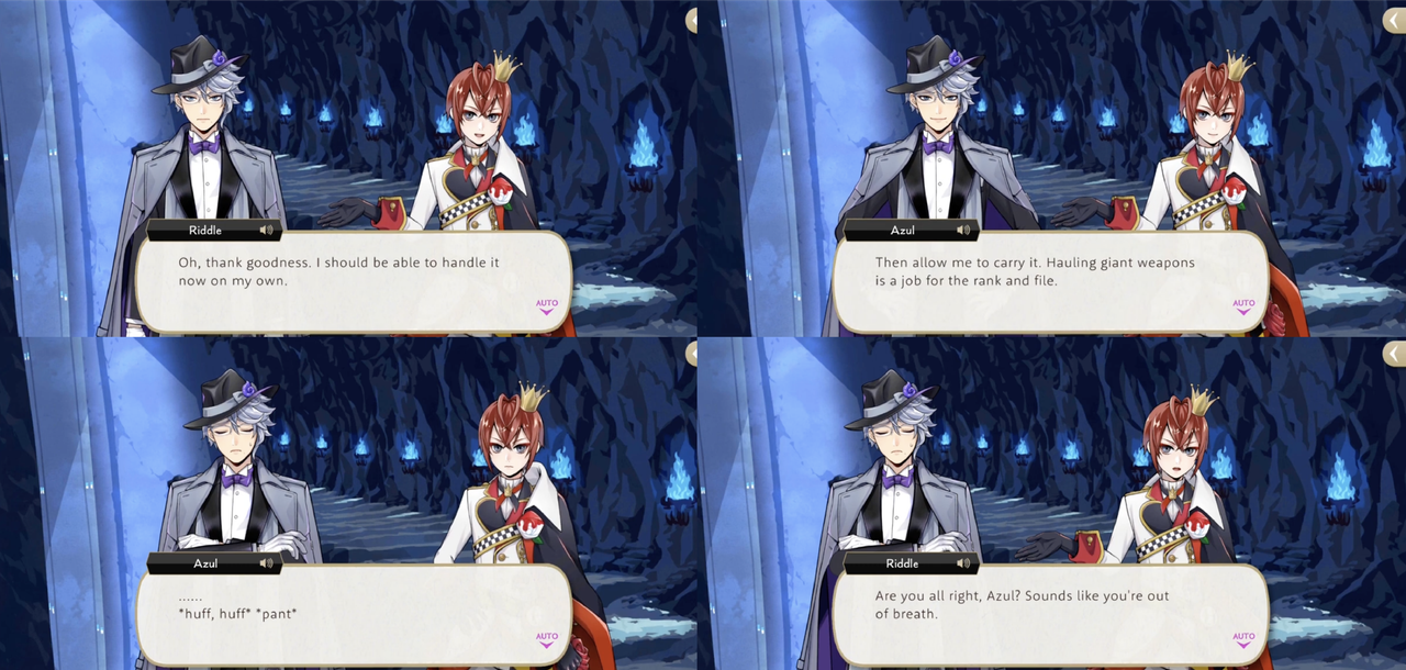 Riddle asks for help lifting it and Azul struggles under its weight, despite how this would have been the ideal opportunity to illustrate how physically capable Azul really is.
