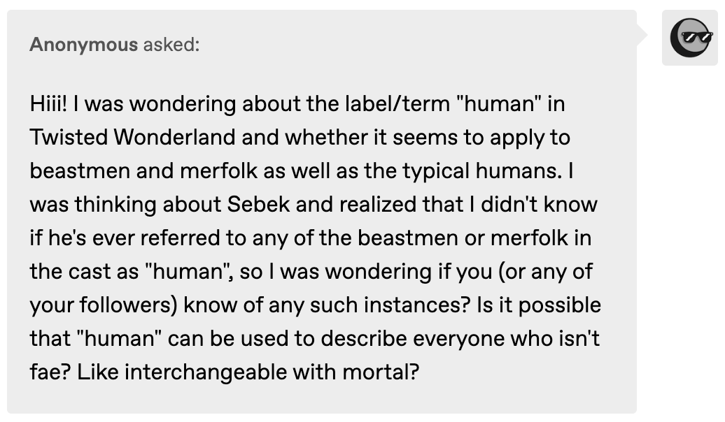 This very topic being was discussed in a Twstsoku thread in 2023 where a similar conclusion was reached. Someone in the comments asks if beast-people are really considered human in the game despite how they are canonically the descendants of animals and they receive the response, “humans are animals.”