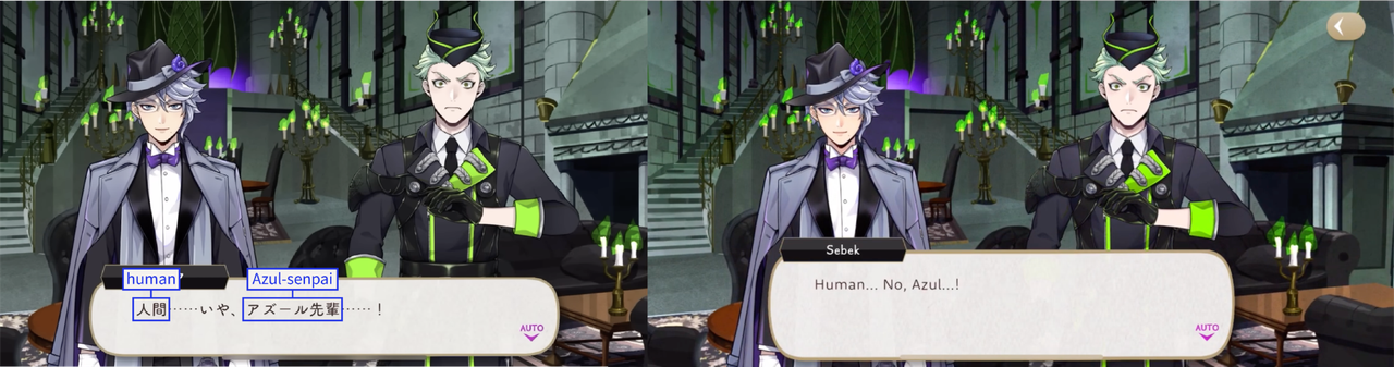 Sebek referring to Azul as a human is a point in Malleus’ Glorious Masquerade vignette: Azul compliments Malleus, so Sebek corrects himself to call Azul by name instead (even referring to him with the “-senpai” honorific) after he calls him human.