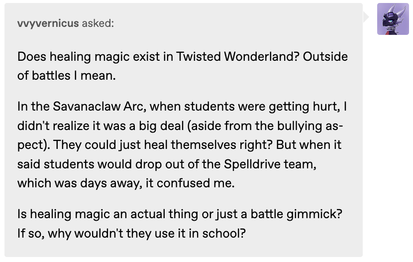 ・Ruggie getting injured in the spelldrive tournament (in revenge for all the people he’d injured earlier) and dried out during Leona’s overblot