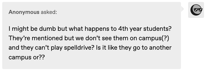 Both Crewel and Riddle mention the fourth-year students being on-campus for the culture fair, but we never meet anyone in-game.
