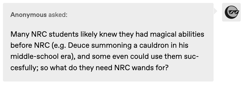 While not officially confirmed, the faculty of NRC seems to have their magestones attached to various accessories rather than pens, while the students of RSA seem to be using their magestones as badges rather than pens, and Rollo’s magestone is maybe his ring.