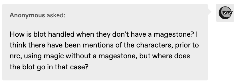 But blot does not seem to be something that a mage must be burdened by forever once it starts accumulating inside of them, with Crowley saying that eating well and getting plenty of sleep will result in most of the blot clearing away from a magestone, so that is possibly how it is cleared from a mage’s body, as well? Maybe!