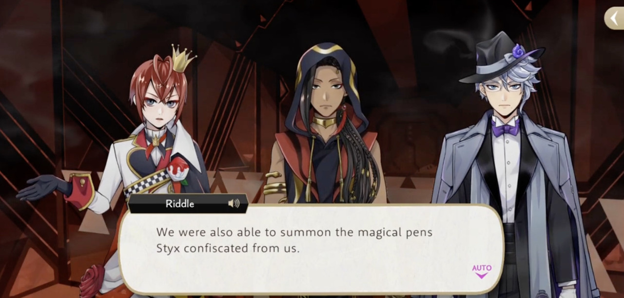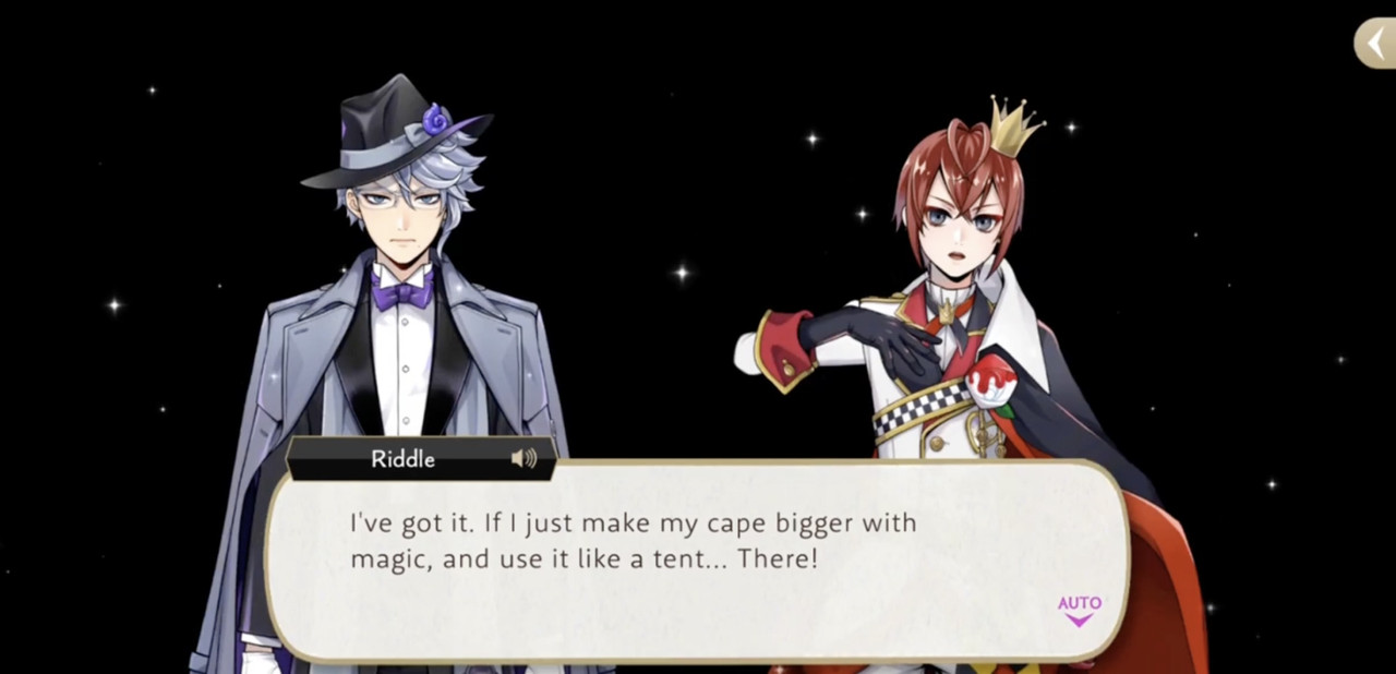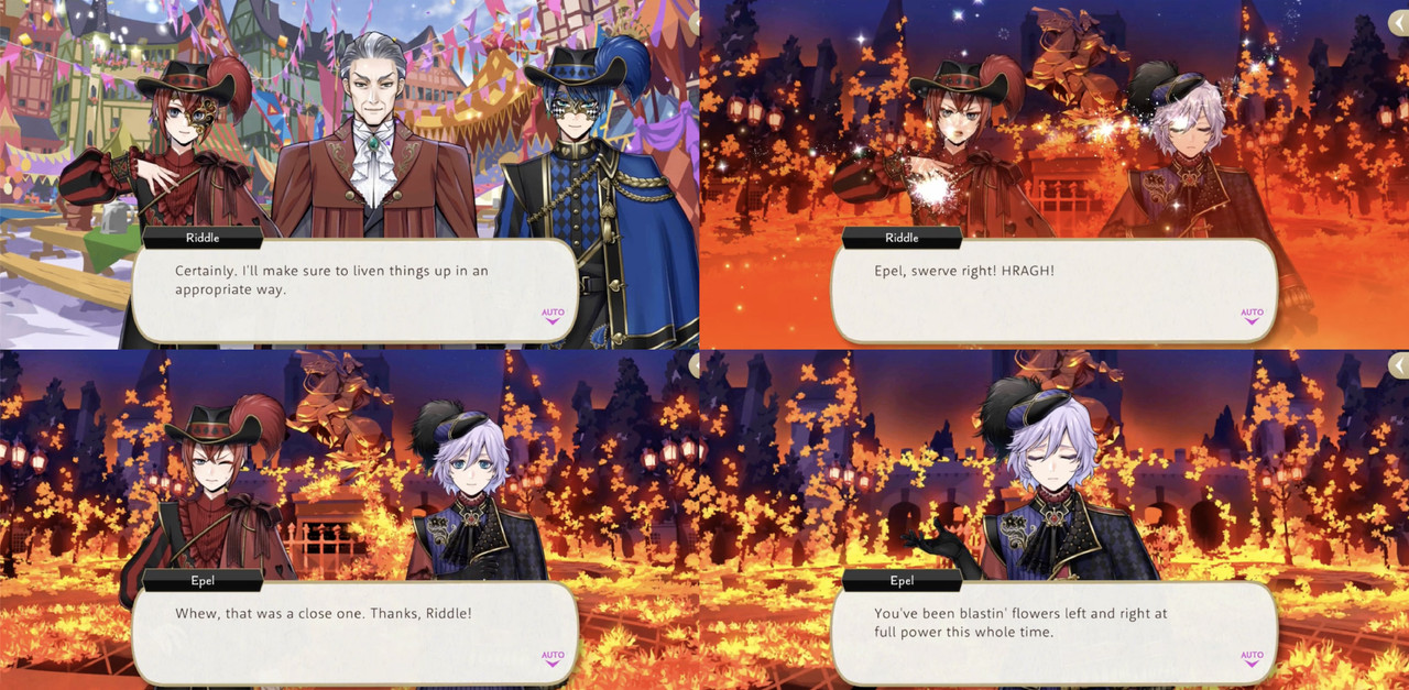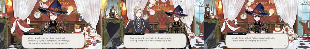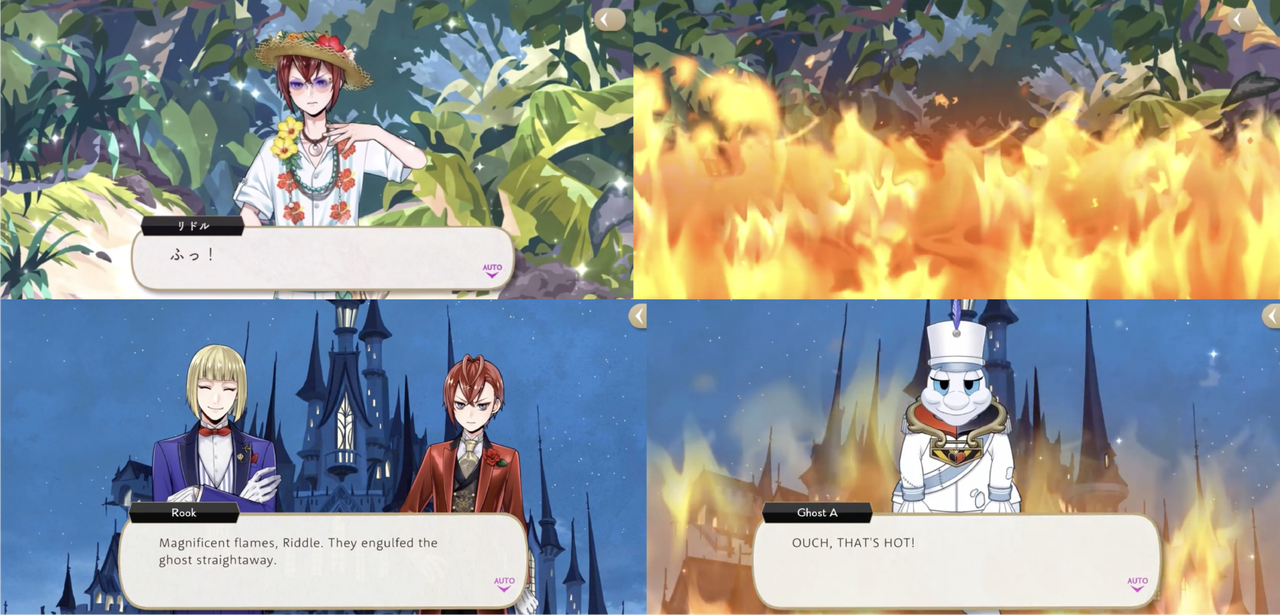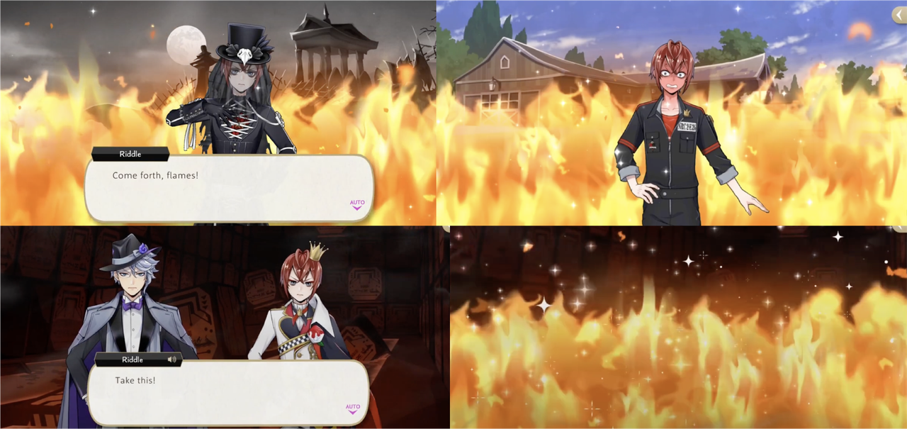 Riddle seems partial to flame magic, using it in battles during Spectral Soiree, Book 6, Phantom Bride and the Stitch event. He also uses magic to make fireworks and blast fire lotuses during Glorious Masquerade.