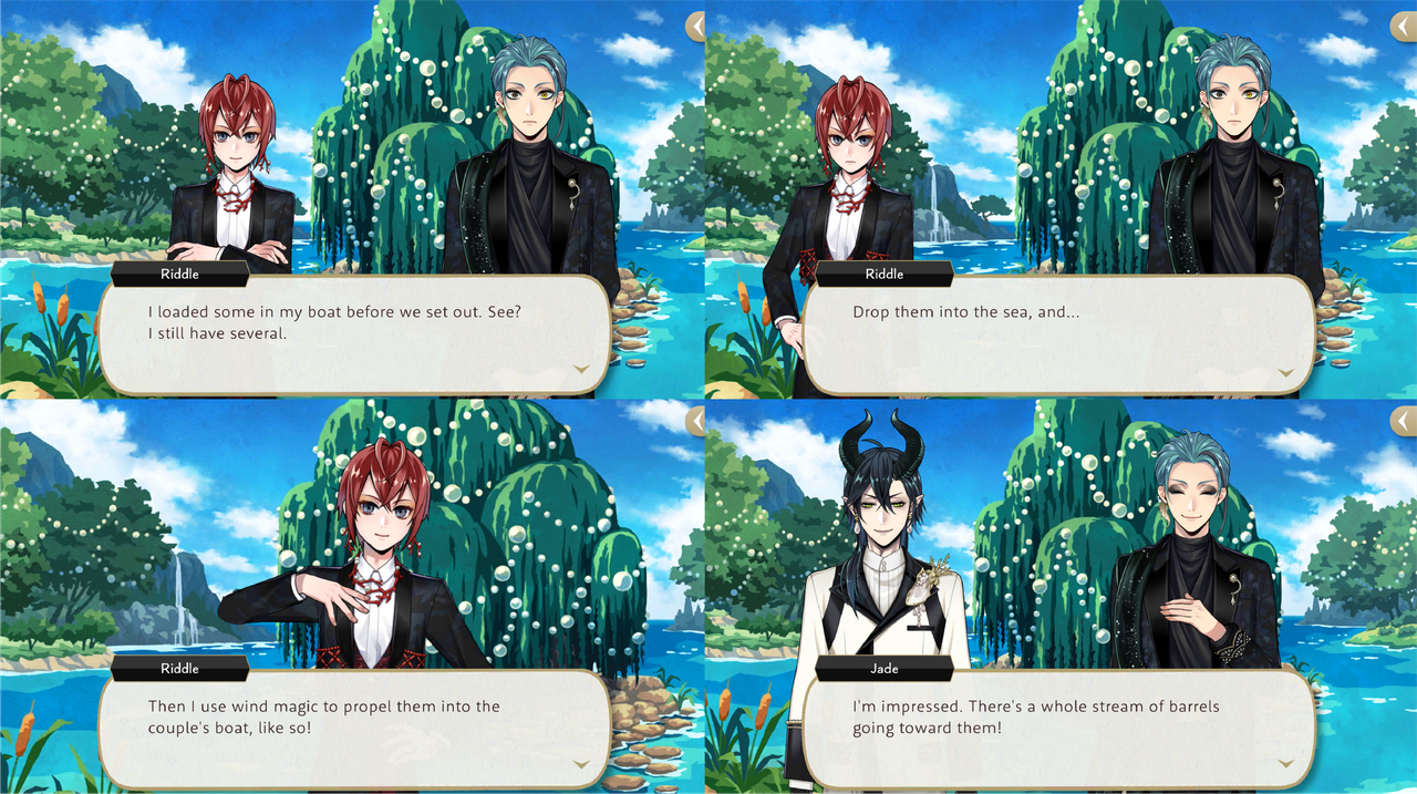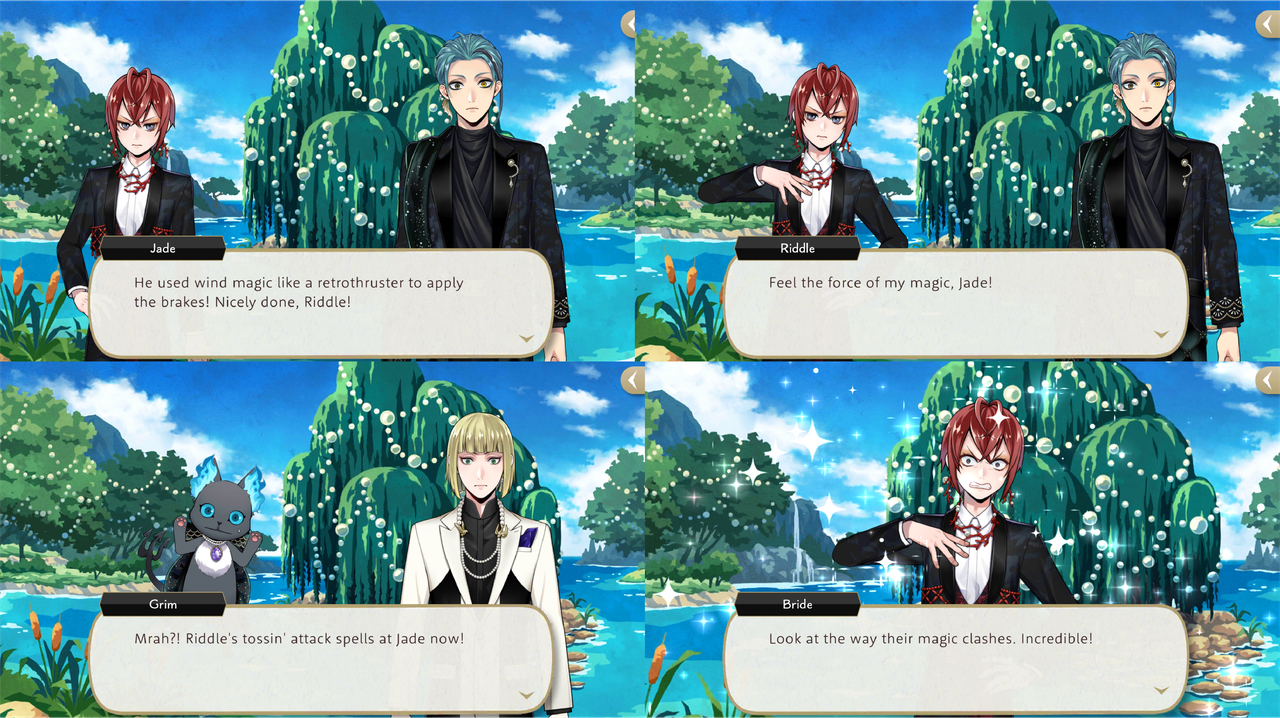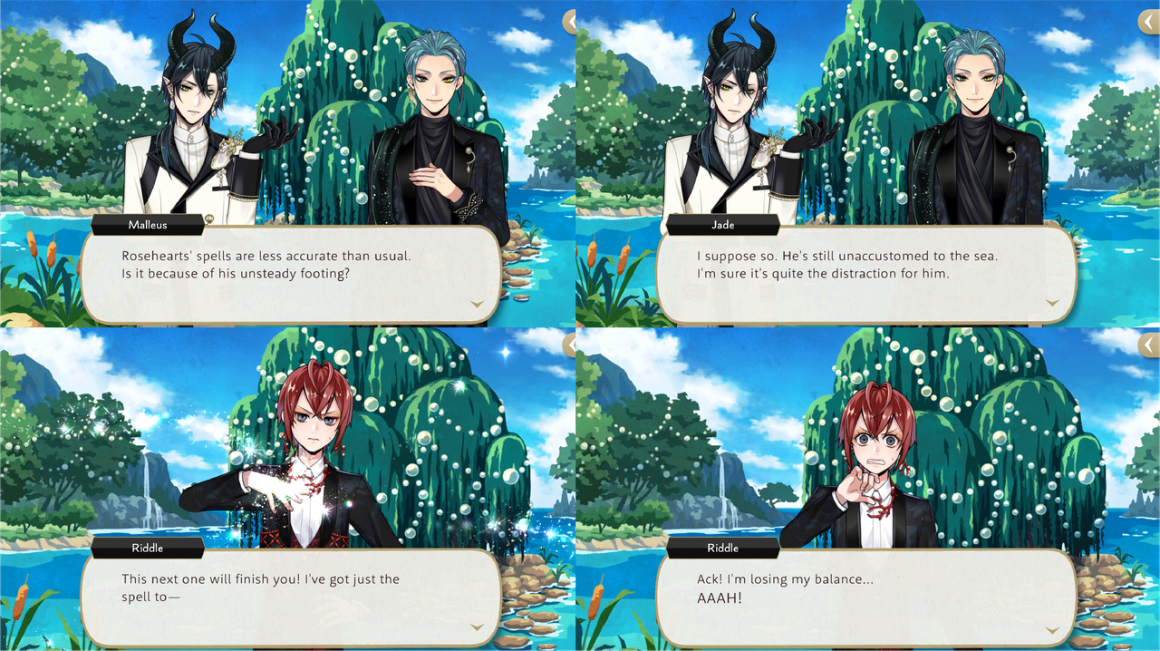 Riddle uses unspecified attack magic again during the Eternity Float event and Malleus comments that his spells are less accurate than usual, possibly due to his unsteady footing as he is standing in a boat at the time.