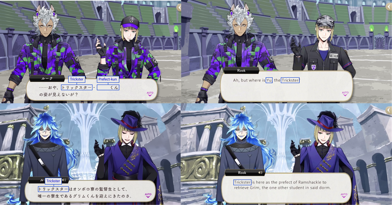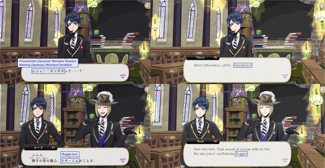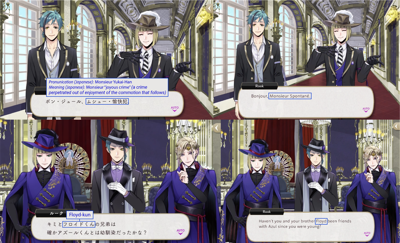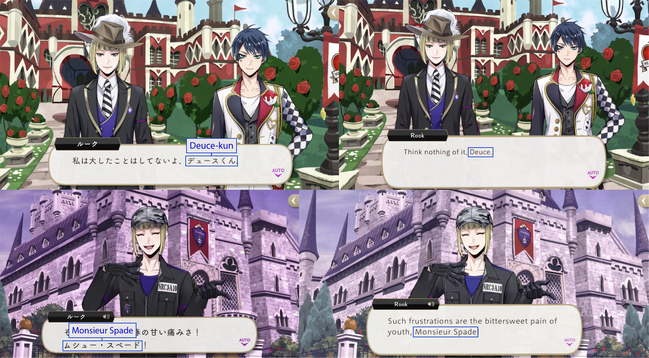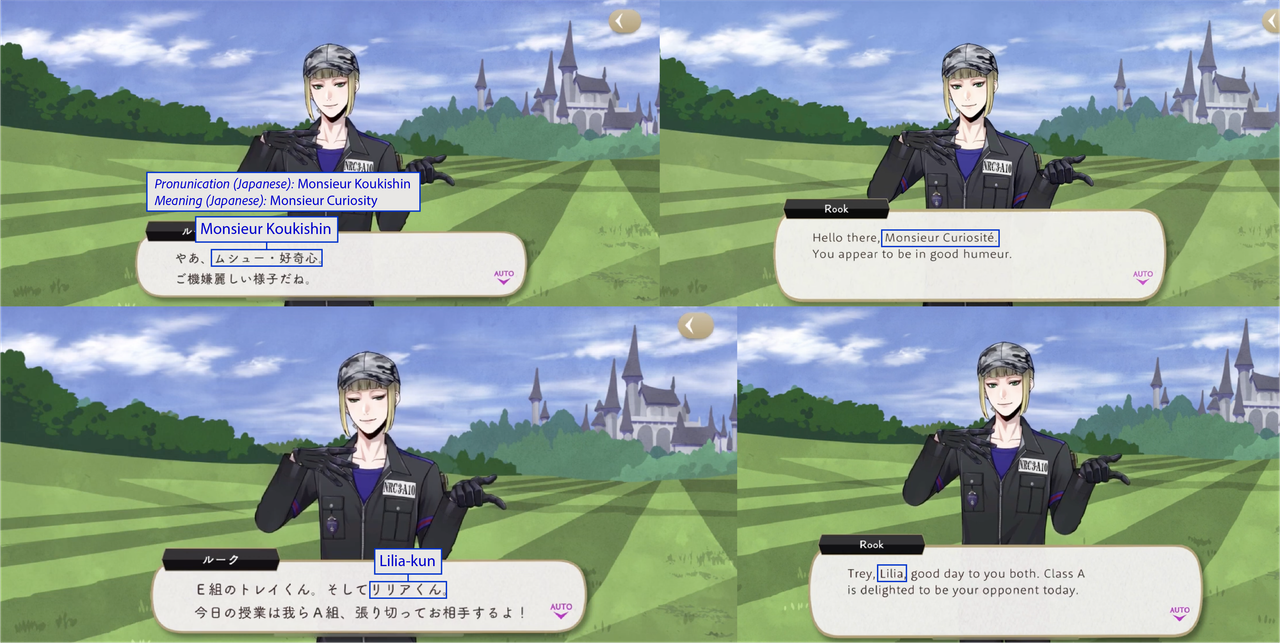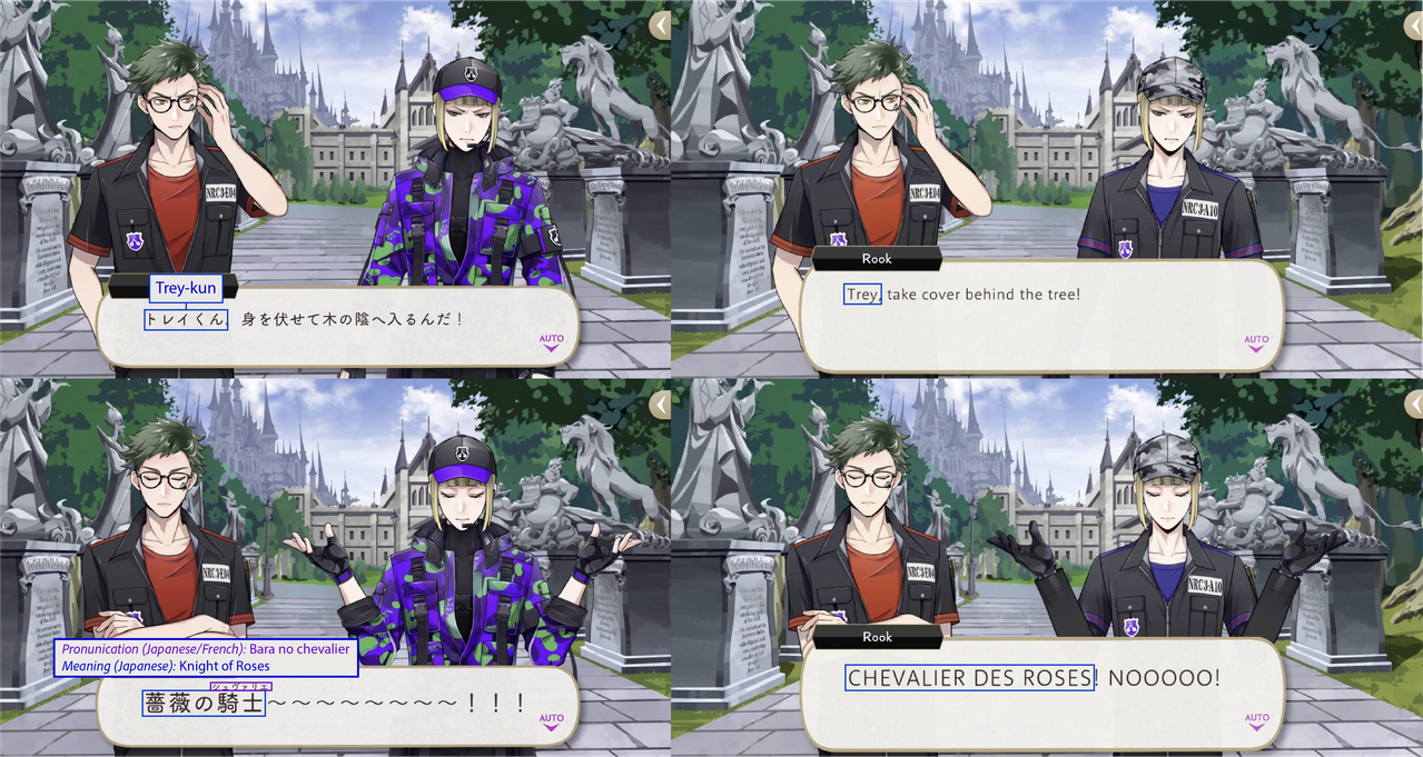 (While both Trey and Riddle have “roses” in the meaning of their nicknames, Riddle’s is translated while Trey’s is not: his “roses” pronunciation is in Japanese)