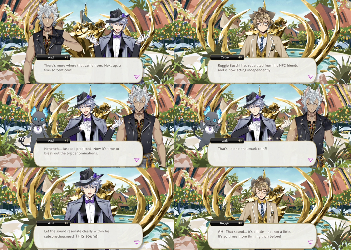 It is Azul who comes up with the idea for awakening Ruggie: dropping coins in larger and larger denominations. Ruggie is thrilled by the sound but confused by why he is “getting so giddy over finding a little loose change.”