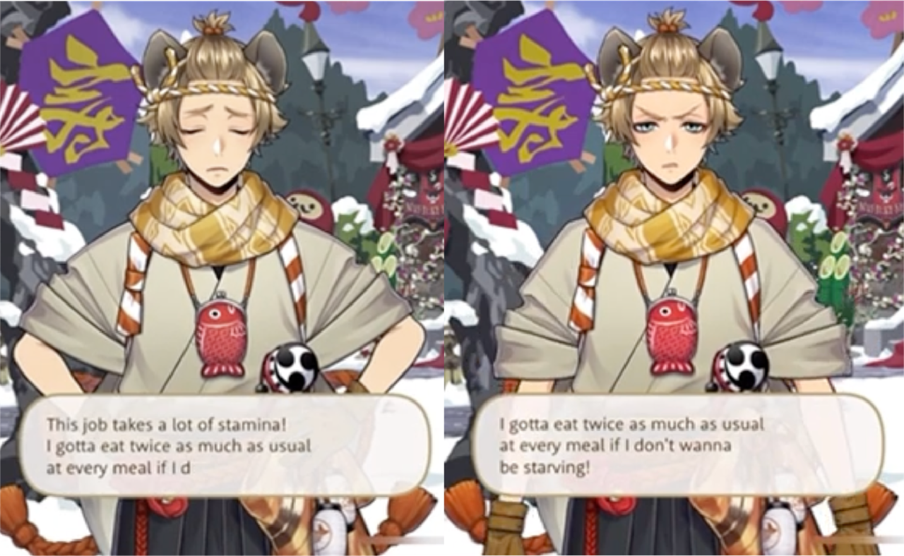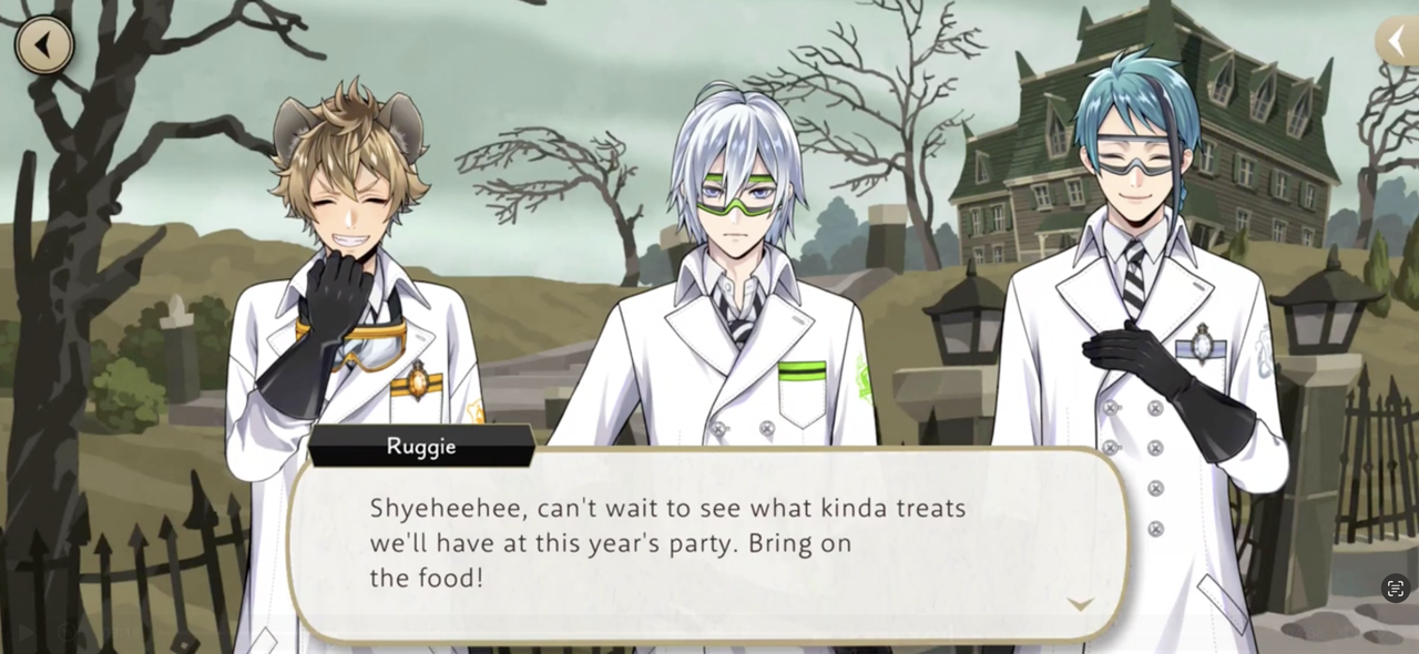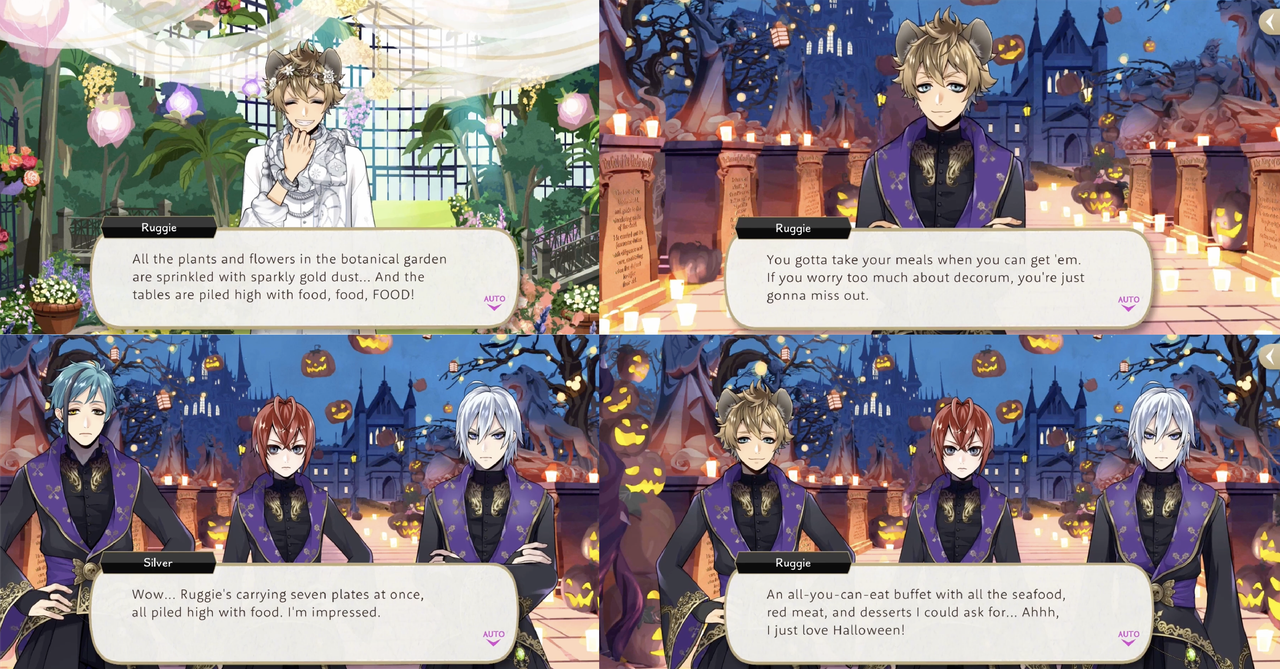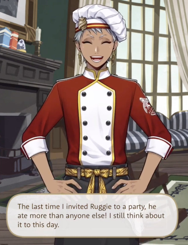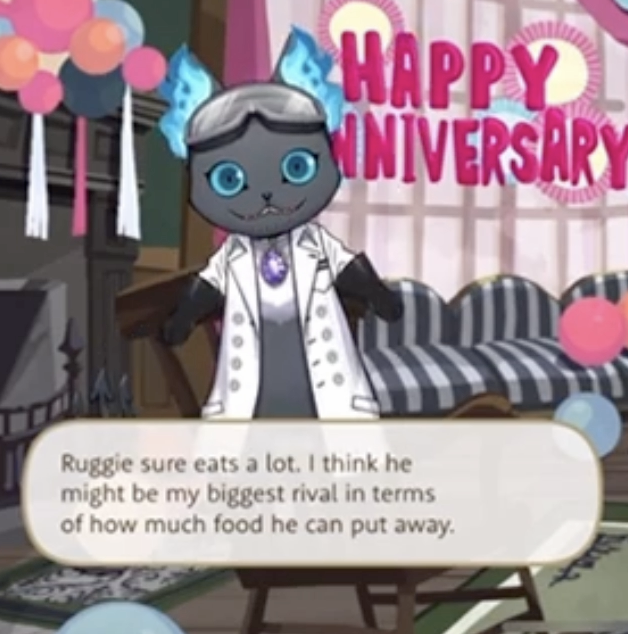 Enjoying food at parties is a theme for Ruggie as seen during Fairy Gala, Halloween and Spectral Soiree, where other characters comment on how much he eats (Silver: “Ruggie’s carrying seven plates at once, all piled high with food”.)