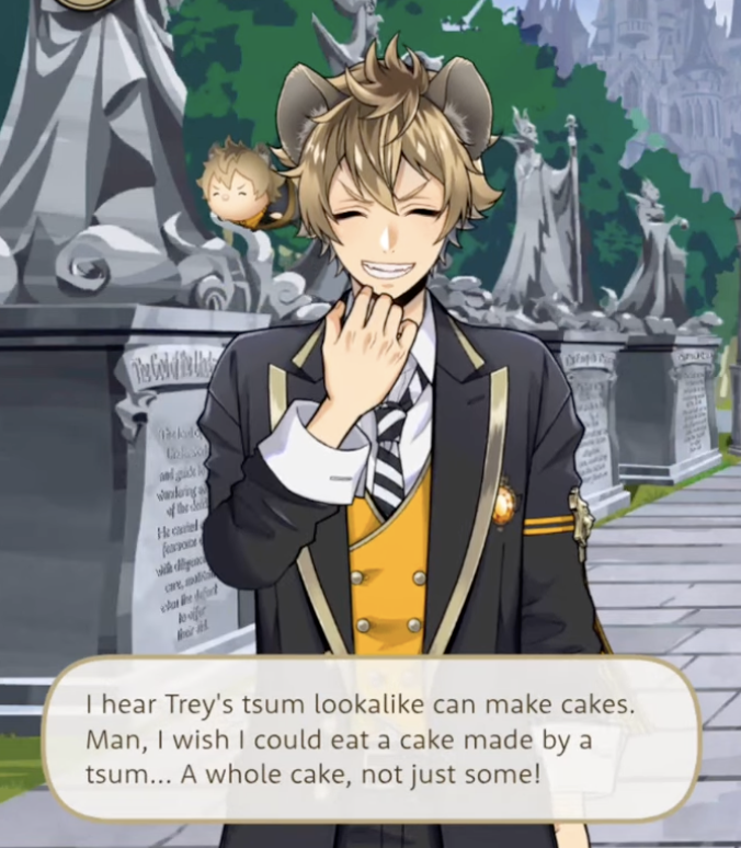 Ruggie refuses the offer of a dance with Riddle in order to prioritize the Spectral Soiree buffet, where he is joined by Lilia, who says that it is a pleasure to watch him eat. Ruggie takes a serving of everything available at the party and says that it is nowhere near enough to fill him up.