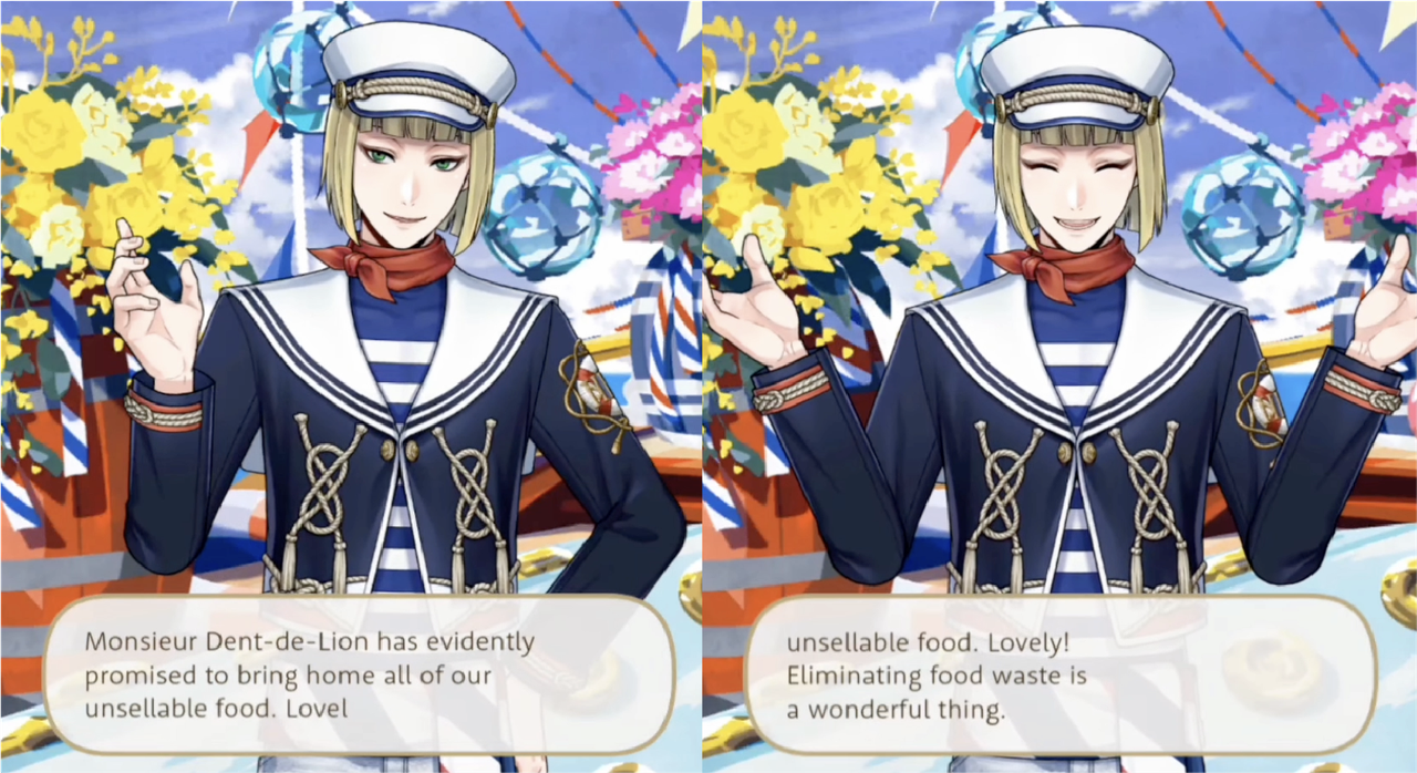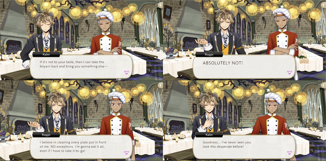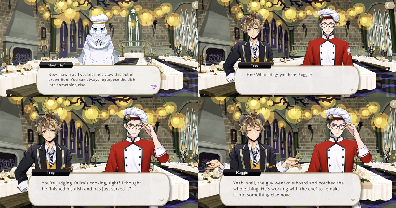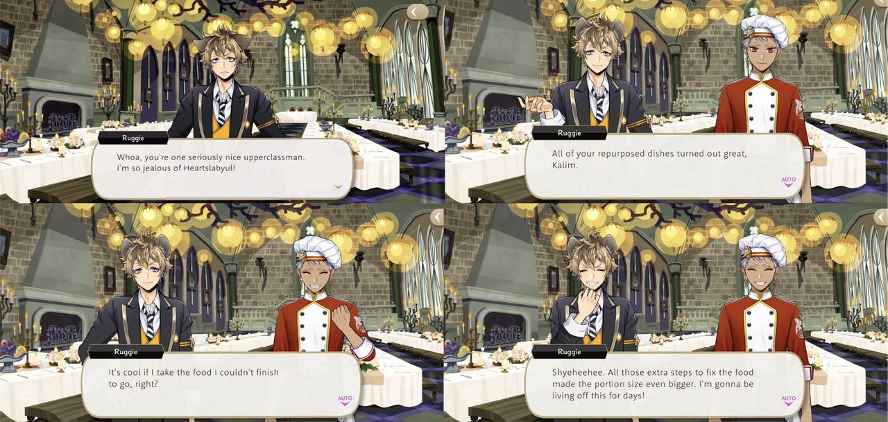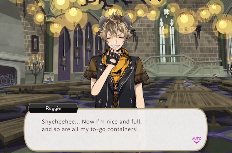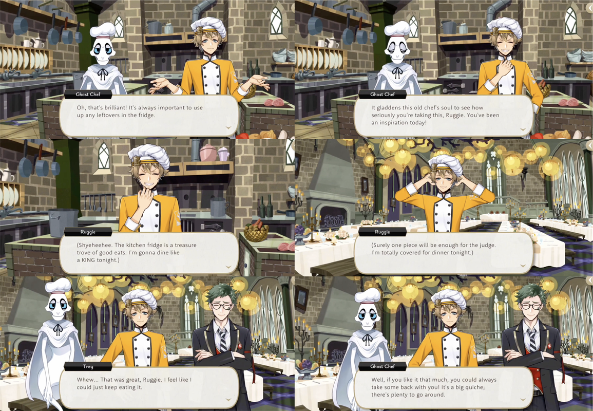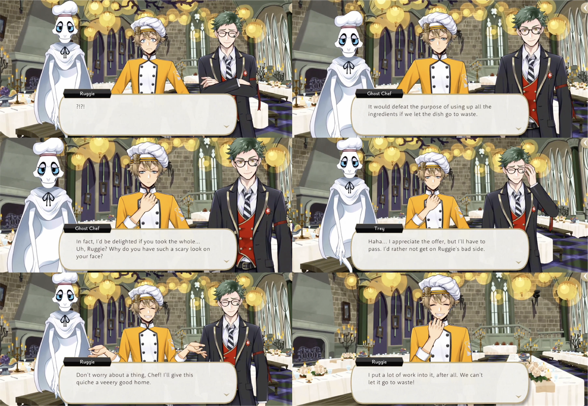 Ruggie’s plan is almost compromised when the ghost chef encourages Trey to take home the leftovers instead. Due to Ruggie’s “scary look” Trey refuses the offer (“I’ll have to pass. I’d rather not get on Ruggie’s bad side”), with Ruggie successfully acquiring the desired leftovers.