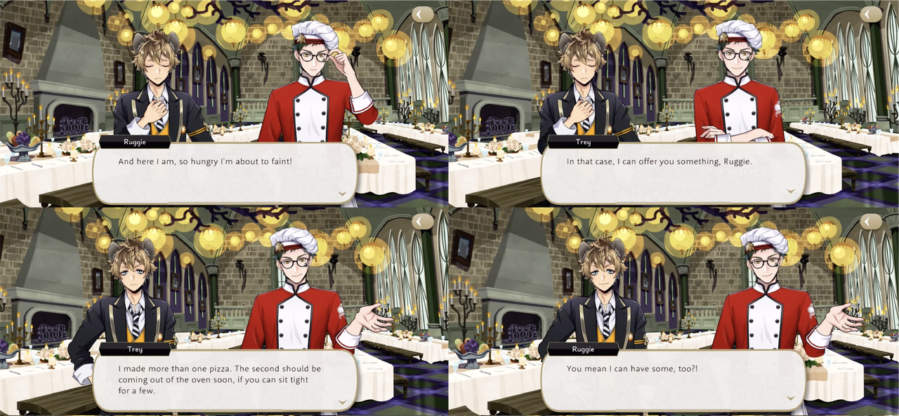 Ruggie tries his best to eat even Kalim’s cooking during Culinary Crucible, saying, “I believe in cleaning every plate put in front of me. NO exceptions.” The chef ghost takes pity on him and helps Kalim to repurpose the dish, during which time Ruggie wanders into Trey’s vignette for food. Trey gifts Ruggie with a second pizza he has already prepared.