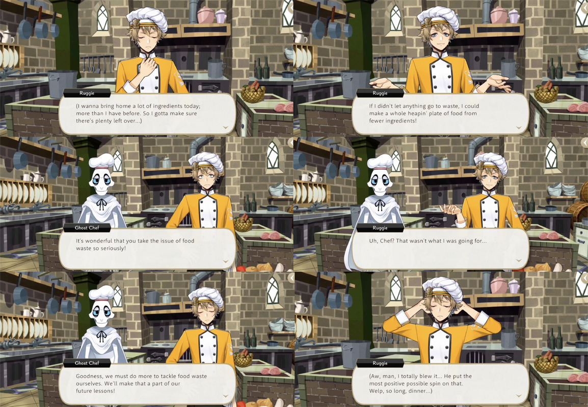 Ruggie begins his Master Chef course by deciding to leave behind as many ingredients as possible so that he will be able to bring home anything he doesn’t use, but the chef ghost interprets his idea to make more food from fewer ingredients as the desire to cut down on food waste.