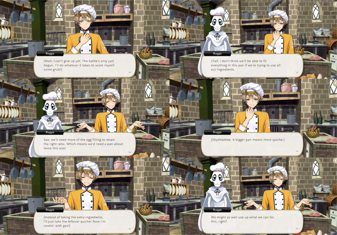 Changing tactics, Ruggie decides to use every ingredient he has (and some leftover ingredients he receives from the ghost chef), increasing the size of the pan for his dish: “Instead of taking the extra ingredients, I’ll just take the leftover quiche!…I’m gonna dine like a KING tonight!”