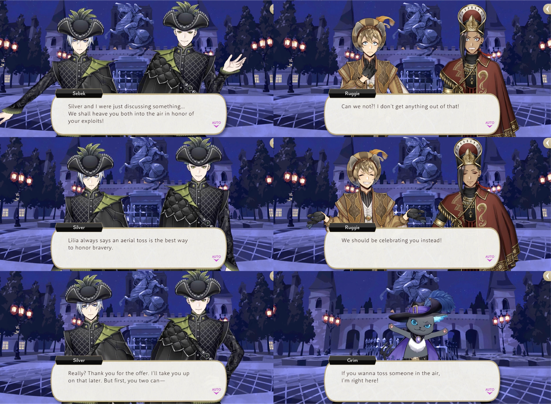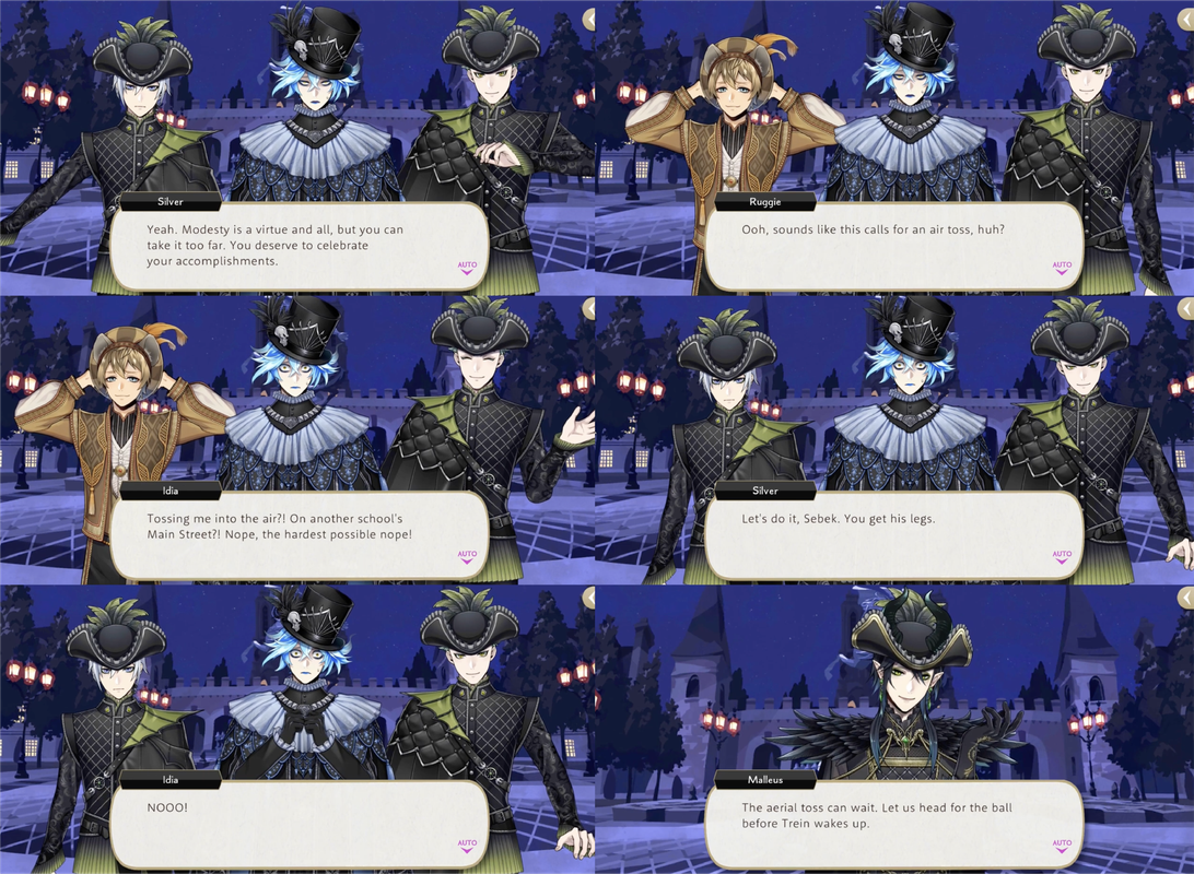 After the drama of Glorious Masquerade Silver and Sebek announce that they will be heaving Jamil and Ruggie into the air in honor of their exploits, but they are saved by Grim. Ruggie encourages them to toss Idia into the air instead. Idia is saved by Malleus.