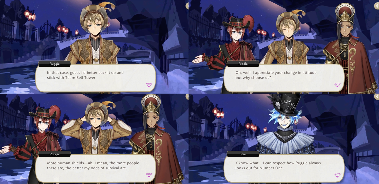 When given the choice to go into the town or to the bell tower Ruggie chooses the tower group (“More human shields-ah, I mean, the more people there are, the better my odds of survival are”) and Idia says, “I can respect how Ruggie always looks out for Number One.”