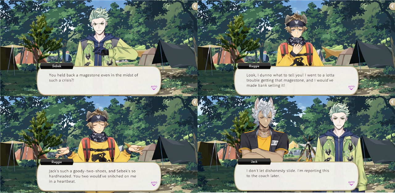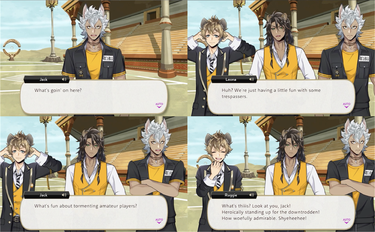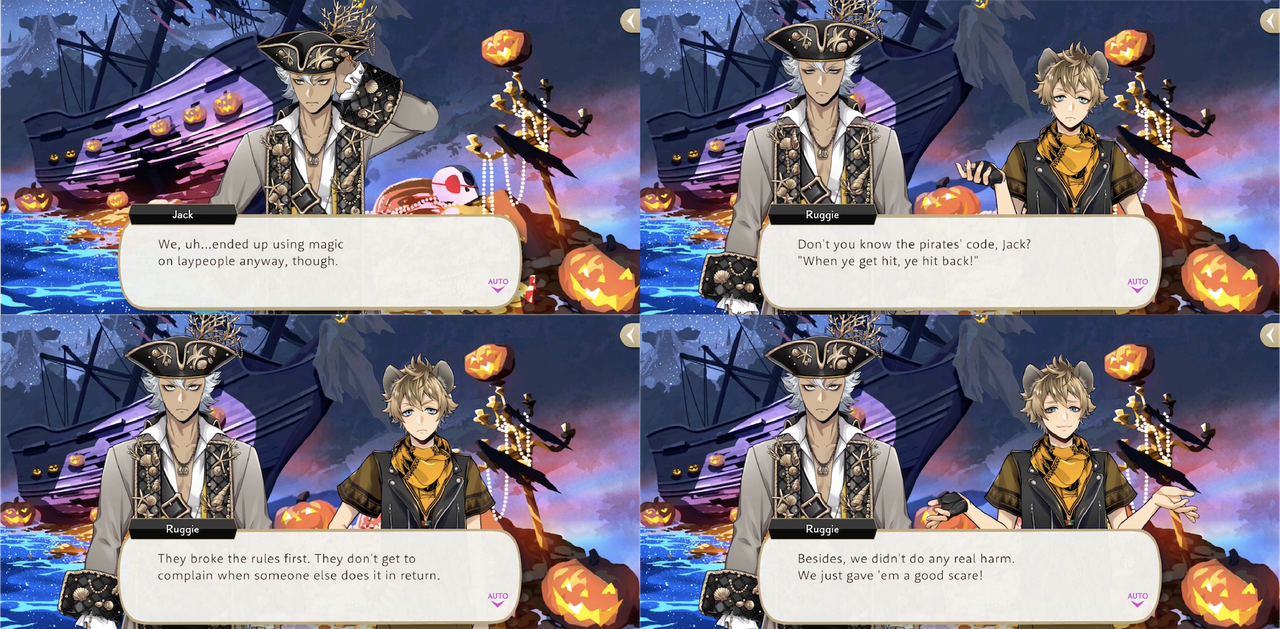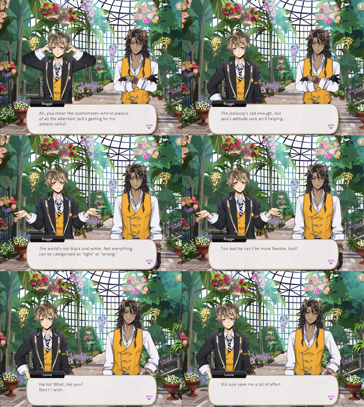 Ruggie teases Jack for “heroically standing up for the downtrodden” when Leona and Ruggie play against Ace, Deuce and the others in a practice game of Spelldrive during Book 2, and expresses frustration at Jack’s attitude, saying, “the world’s not black and white. Not everything can be categorized as ‘right’ or ‘wrong’. Too bad he can’t be more flexible, huh?’.