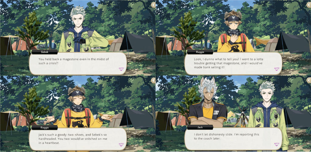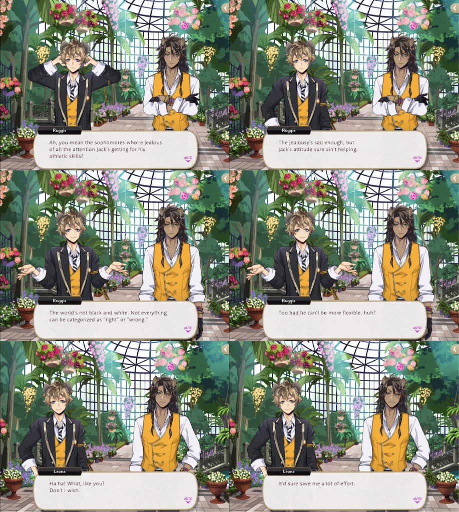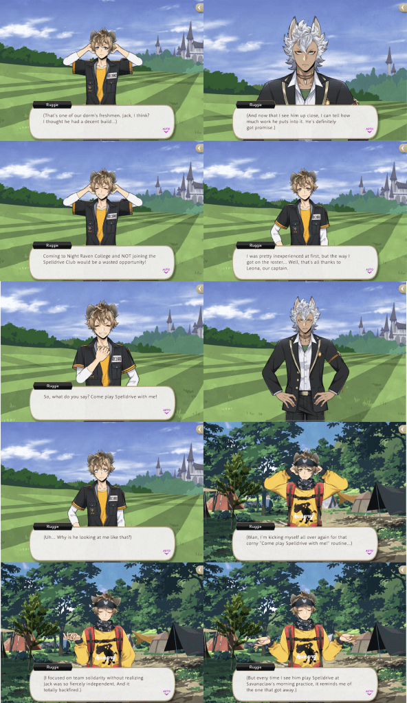 Ruggie teases Jack for “heroically standing up for the downtrodden” when Leona and Ruggie play against Ace, Deuce and the others in a practice game of Spelldrive during Book 2, and expresses frustration at Jack’s attitude, saying, “the world’s not black and white. Not everything can be categorized as ‘right’ or ‘wrong’. Too bad he can’t be more flexible, huh?”