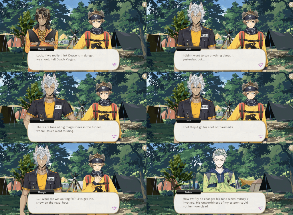 Jack seems to be taking Ruggie’s efforts to heart: in a voice line he says he might be looking to start aspiring “to be like Ruggie and not sweat the little things. But don’t tell him I said that!” And, during Vargas Camp, we see Jack successfully convince Ruggie to join a search in the mines for Deuce by tempting him with magestones.