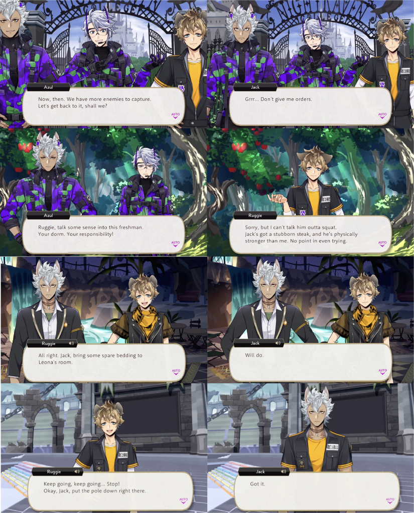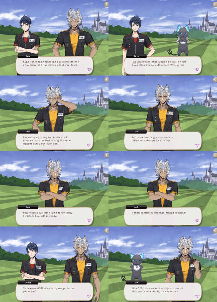 When Grim expresses surprise that Ruggie is so reluctant to accept Jack’s help, Jack explains that he is “just trying to stay by his side at all times so that I can back him up if another student picks a fight with him. And every time he goes somewhere, I check to make sure it’s safe first. Plus, when a ball came flying at him today, I shielded him with my body. Is there something else that I should be doing?”