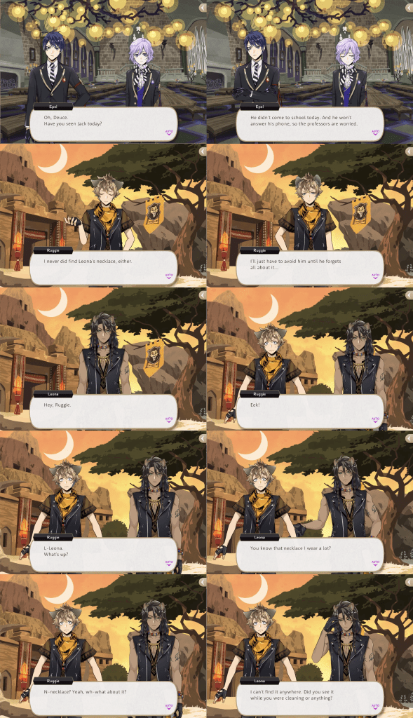 Jack reveals that he used no magic to find the necklace and just climbed every tree in the school, checking crows’ nests throughout the night. Ruggie immediately suspects Jack of wanting to extort him for a finder’s fee, telling Jack outright, “I can’t trust you”.