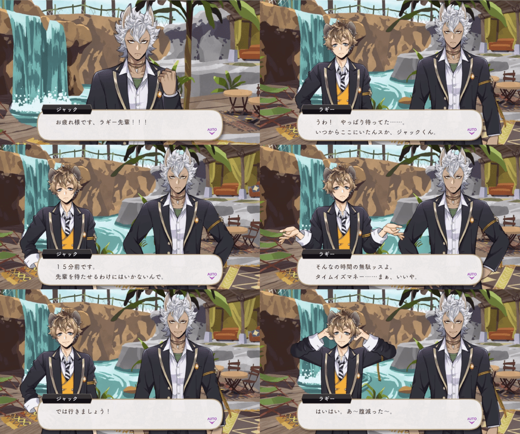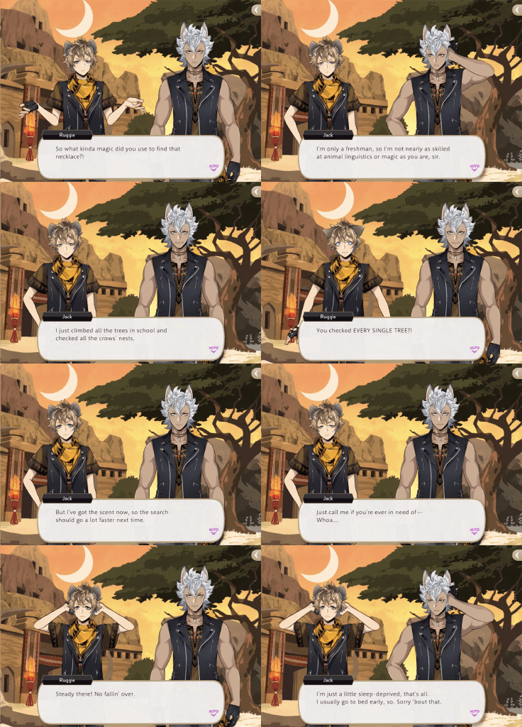 Jack insists upon seeing to Ruggie’s every need, but Ruggie refuses to believe that a “proud wolf” like Jack would willingly obey a “lowly hyaena” like himself, to which Jack responds “If you don’t believe me, then that means I haven’t been working hard enough. I will do everything in my power to earn your trust, sir!”