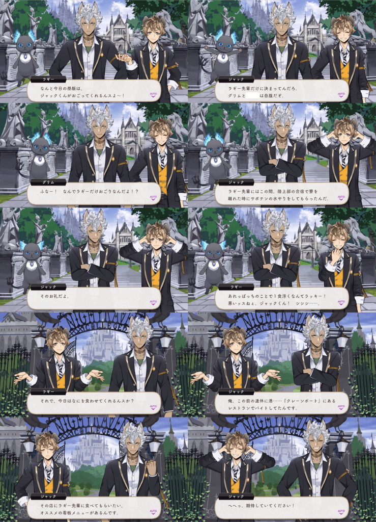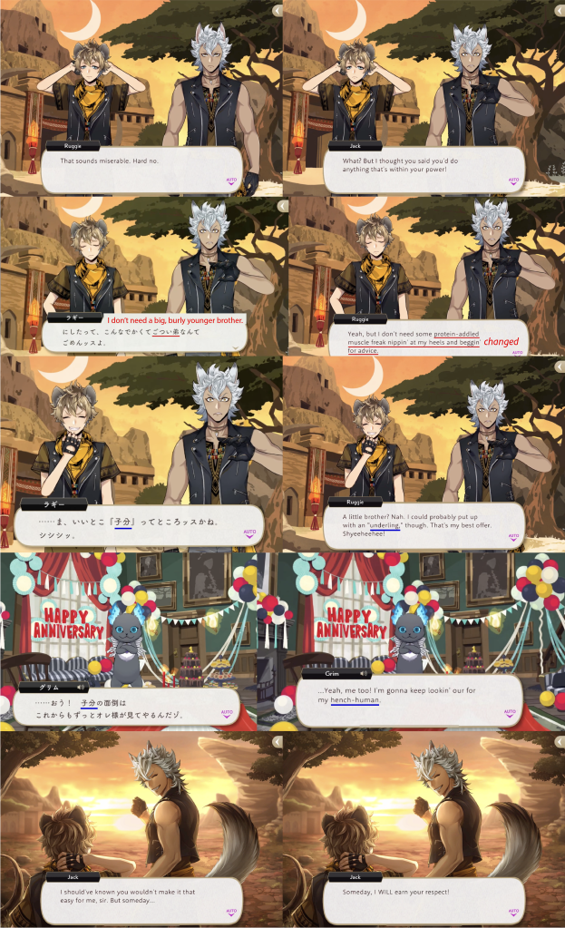 Jack asks if they can enter into an older/younger brother relationship. (The localization here is perfectly accurate, but for the curious: Jack is literally asking permission to call Ruggie “aniki” for “older brother.” In a line that was embellished on EN, Ruggie turns down Jack’s request to establish a mentor/mentee relationship.)