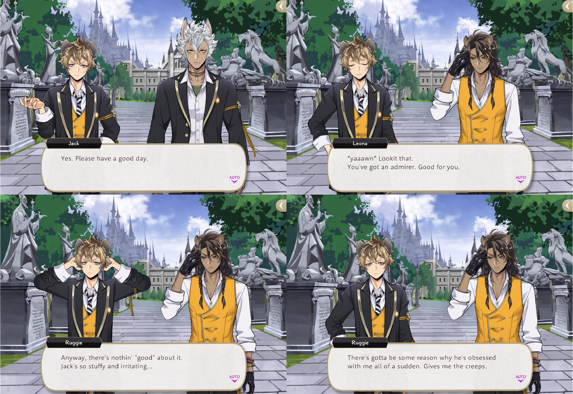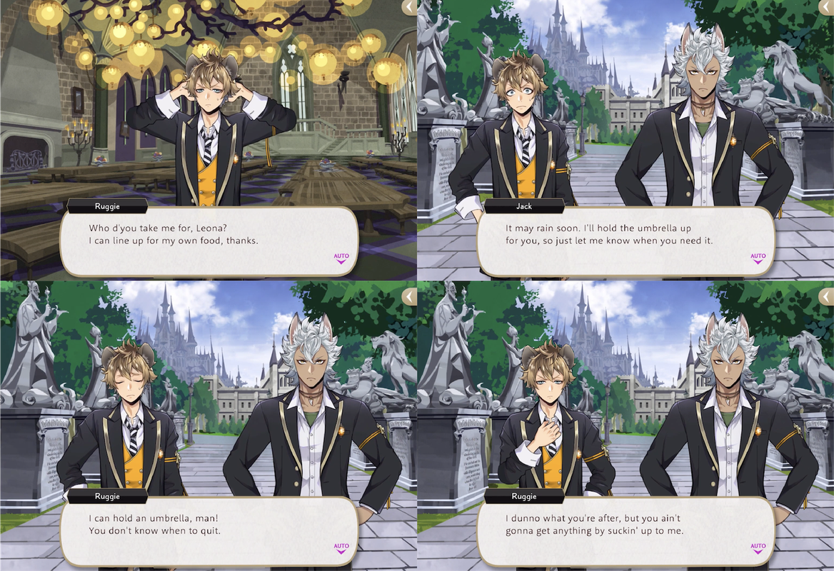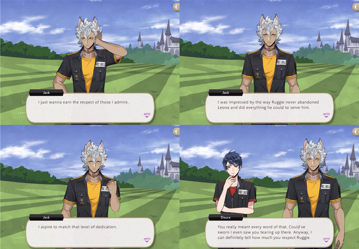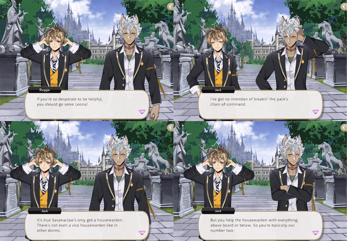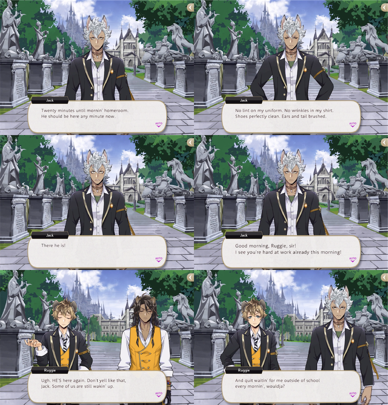 In Jack’s dorm vignette we learn that he respects Ruggie immensely, meeting him in front of the school and refusing to go inside without greeting him, as “That’d be rude”, despite Ruggie’s protests.