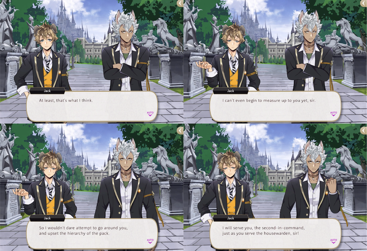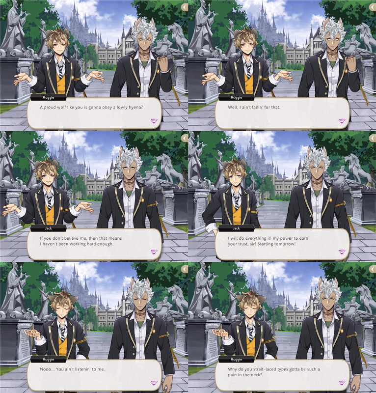 Ruggie refuses to believe that a “proud wolf” like Jack would willingly obey a “lowly hyaena” like himself, to which Jack responds, “If you don’t believe me, then that means I haven’t been working hard enough. I will do everything in my power to earn your trust, sir!”