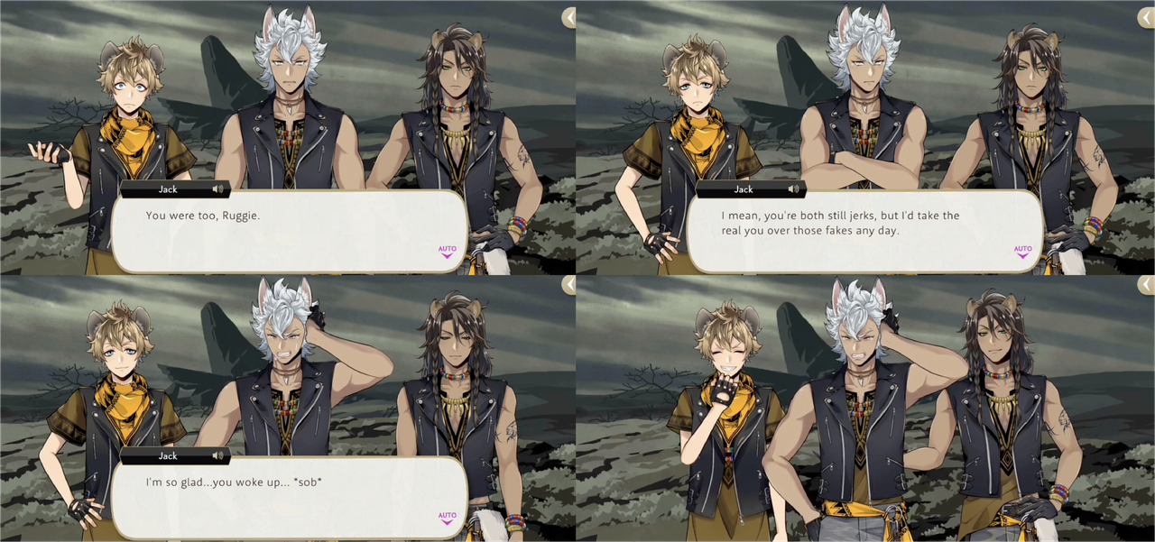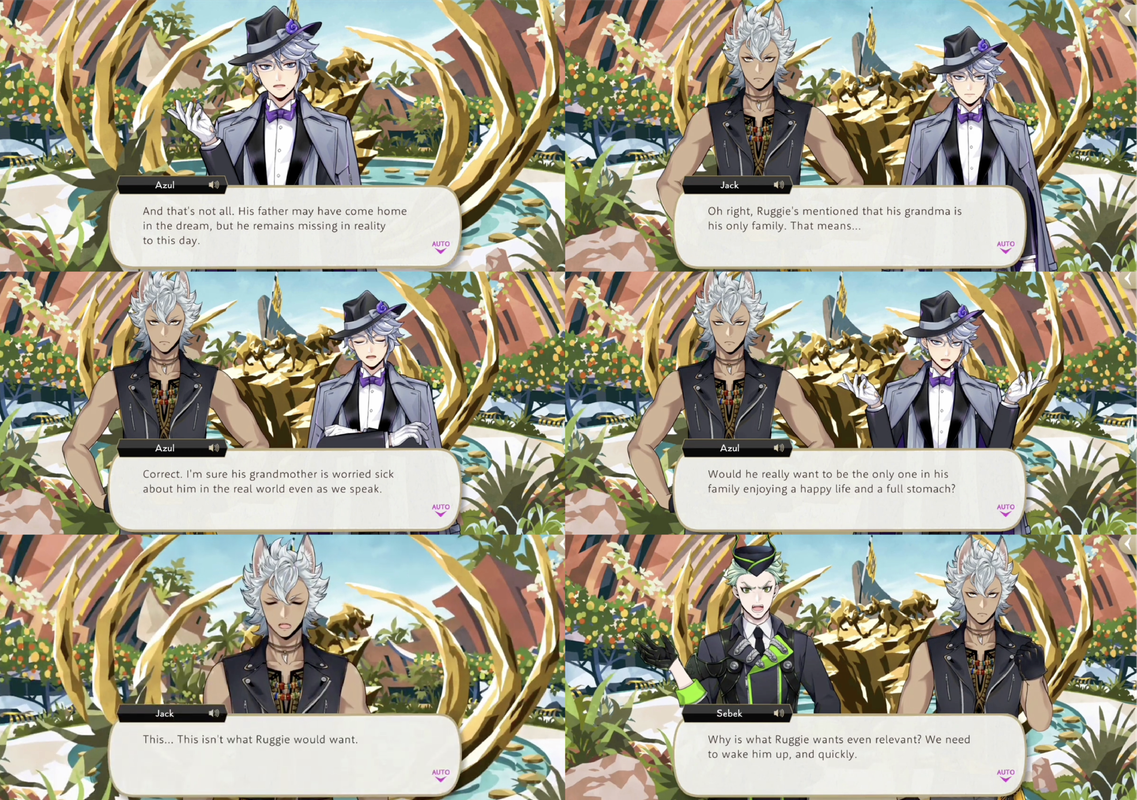 Jack is reluctant to awaken Ruggie from a dream where his father has returned, he is beloved by the townsfolk and never goes hungry (“I know it’s the right thing to do. It’s just, it seems kinda…l dunno, sad”), but agrees after Azul reminds him how Ruggie’s only actual family is likely worrying about him in reality: “This…this isn’t what Ruggie would want.”