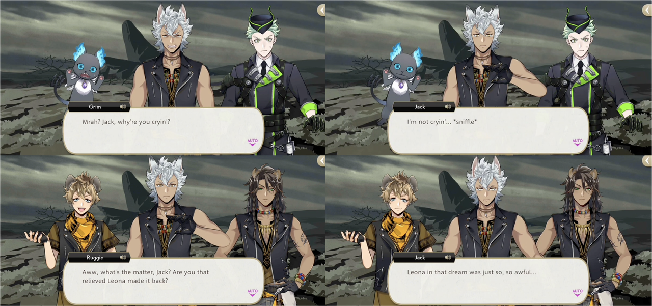 At the conclusion of Leona’s dream Jack begins to cry, saying that both Leona and Ruggie were awful in his dream: “I mean, you’re both still jerks, but l’d take the real you over those fakes any day.”