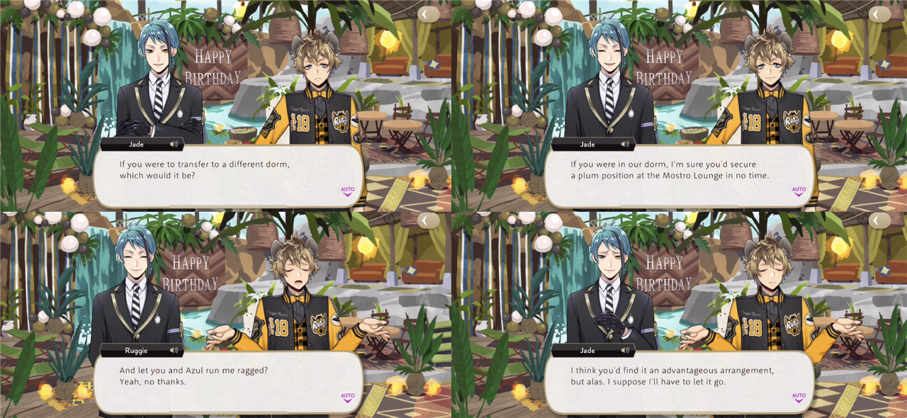 Jade is Ruggie’s interview for his second birthday vignette, gifting him with expensive laundry detergent. After asking what dorm Ruggie would transfer to Jade says “I’m sure you’d secure a plum position at the Mostro Lounge in no time,” but Ruggie responds, “And let you and Azul run me ragged? Yeah, no thanks.”