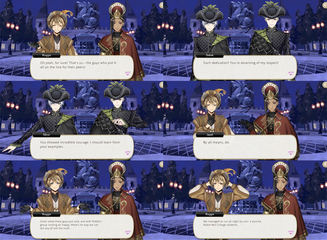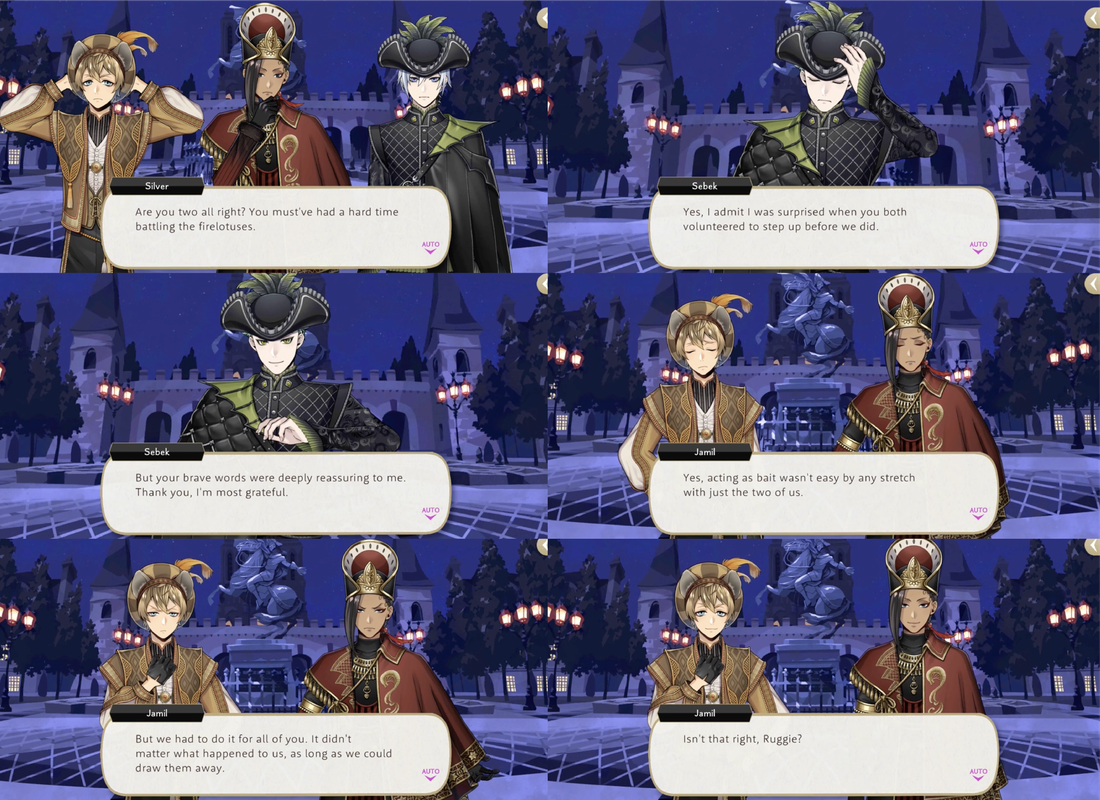 At the conclusion of the Glorious Masquerade event Sebek compliments the Ruggie and Jamil on their efforts. Jamil responds, “Yes, acting as bait wasn’t easy by any stretch with just the two of us. But we had to do it for all of you. It didn’t matter what happened to us, as long as we could draw them away. Isn’t that right, Ruggie?” And Ruggie agrees: “That’s us —the guys who put it all on the line for their peers!”
