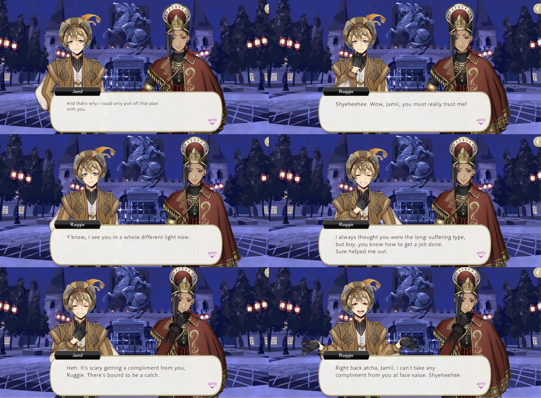Ruggie responds, “Wow, Jamil, you must really trust me! Y’know, I see you in a whole different light now. I always thought you were the long-suffering type, but boy, you know how to get a job done. Sure helped me out,” and Jamil says, “It’s scary getting a compliment from you, Ruggie. There’s bound to be a catch.” Ruggie responds, “Right back atcha, Jamil. I can’t take any compliment from you at face value.”