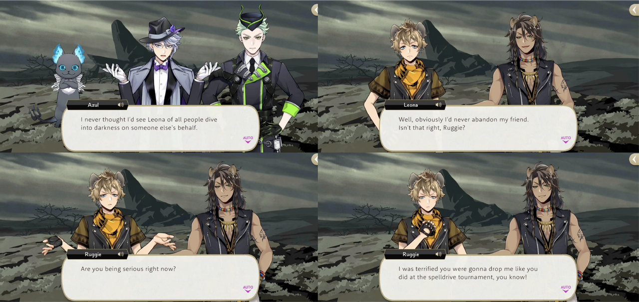 Later Azul observes that he never thought he would see “Leona of all people dive into darkness on someone else’s behalf” and Leona responds, “Well, obviously l’d never abandon my friend. Isn’t that right, Ruggie?”