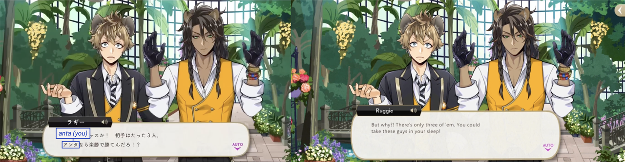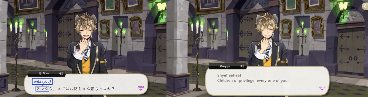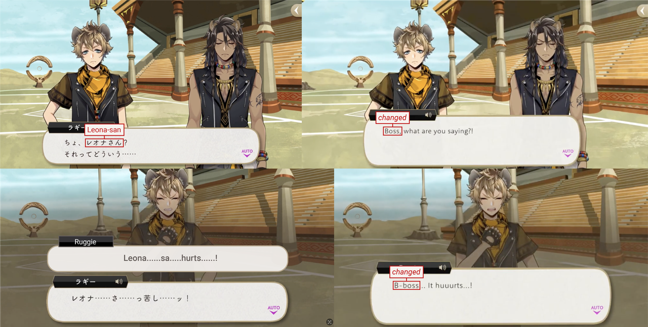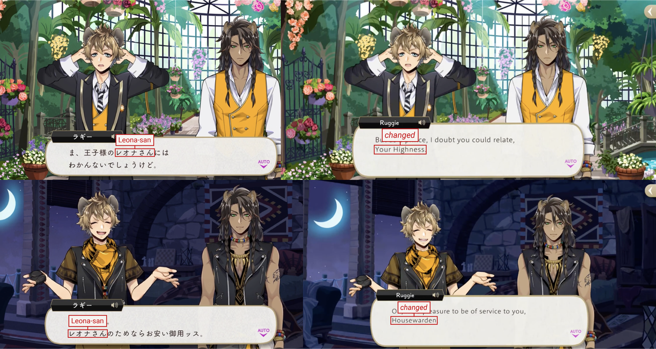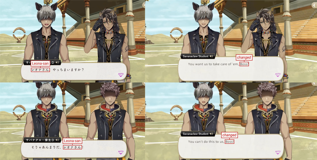 Looking at earlier scenes again “Housewarden” and “Your Highness” were added to Ruggie’s dialogue, but what he is originally doing is saying “Leona-san” to Leona’s face as though they are discussing a different Leona who is not in the room.