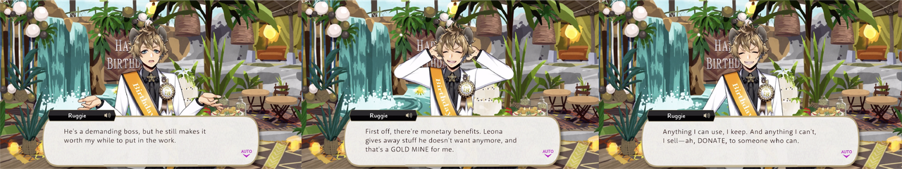 Ruggie says that Leona also gives him hand-me-downs to sell or use as he sees fit in exchange for his work. Rook says that Ruggie attended his birthday party to tell him that Leona would not be coming and then helps himself to the food, so it is maybe possible that the free meal was Ruggie’s compensation for the task.