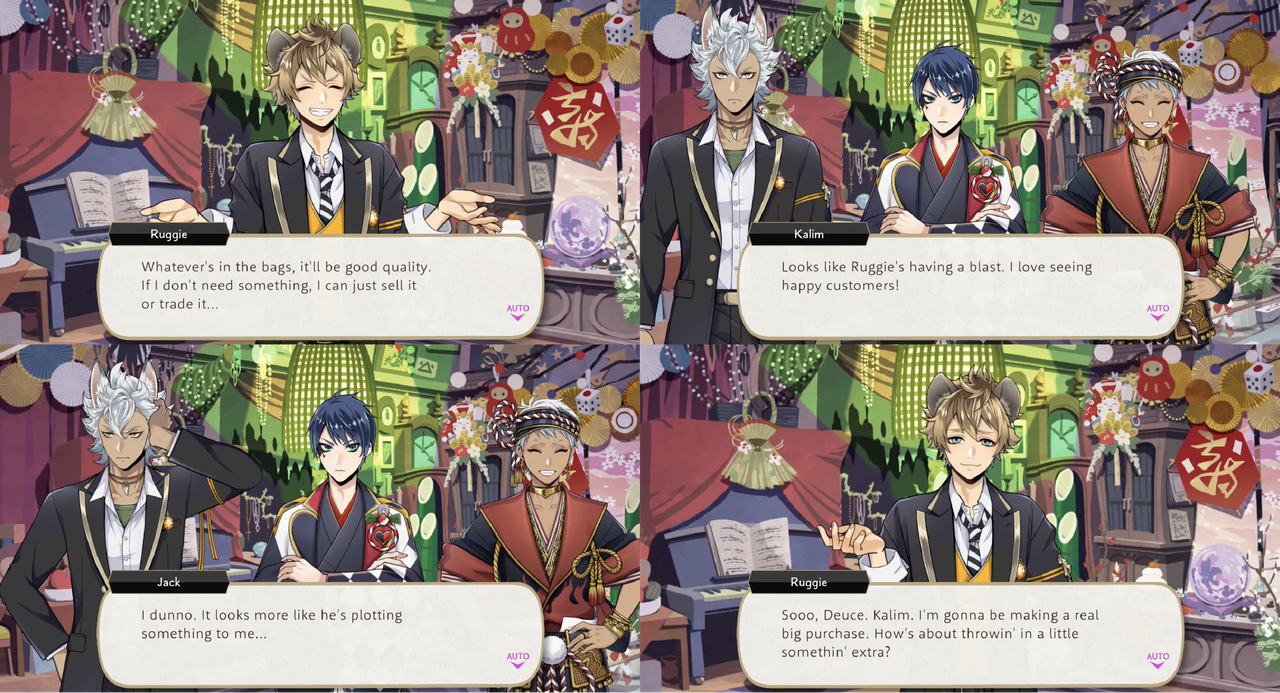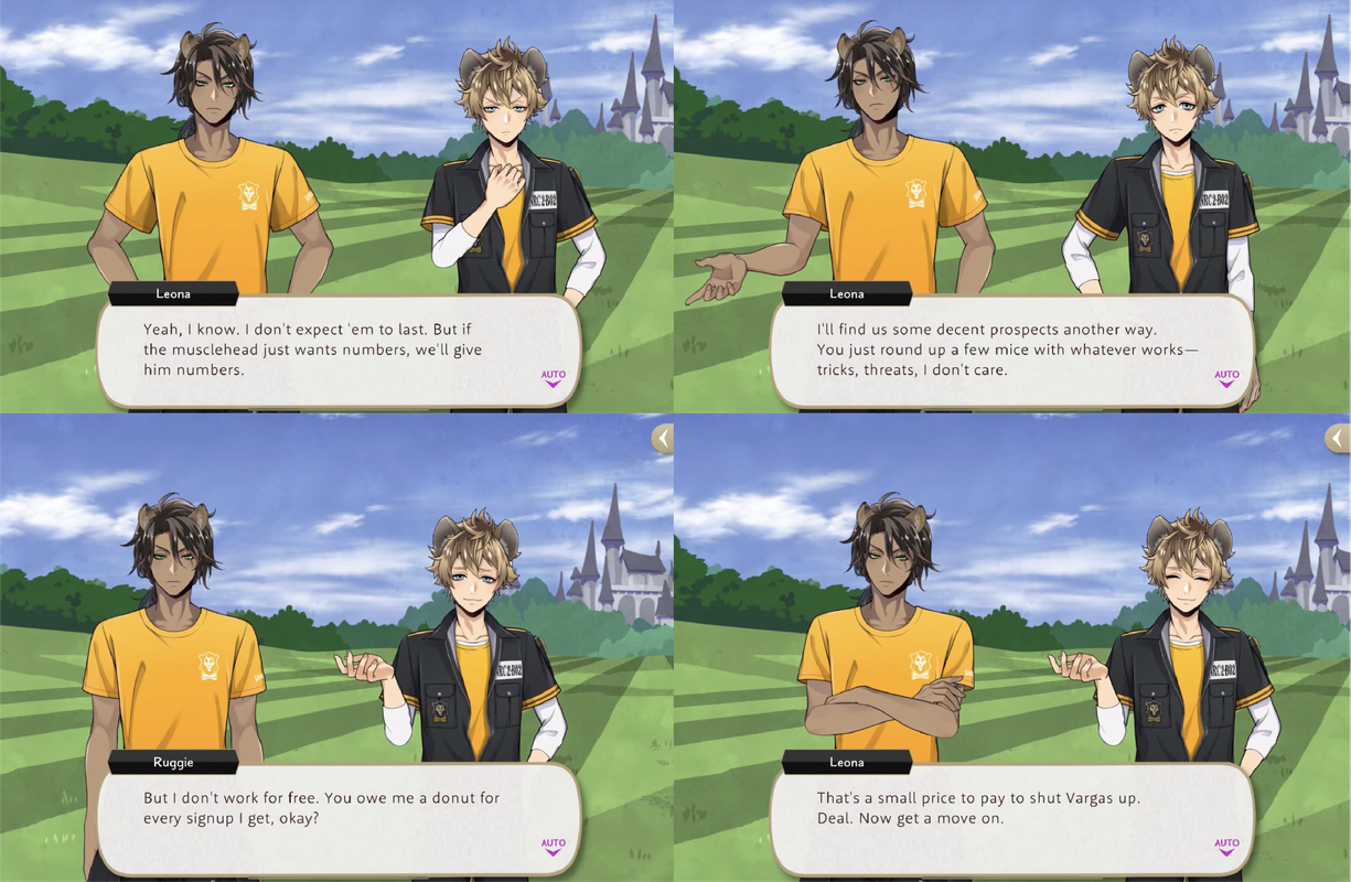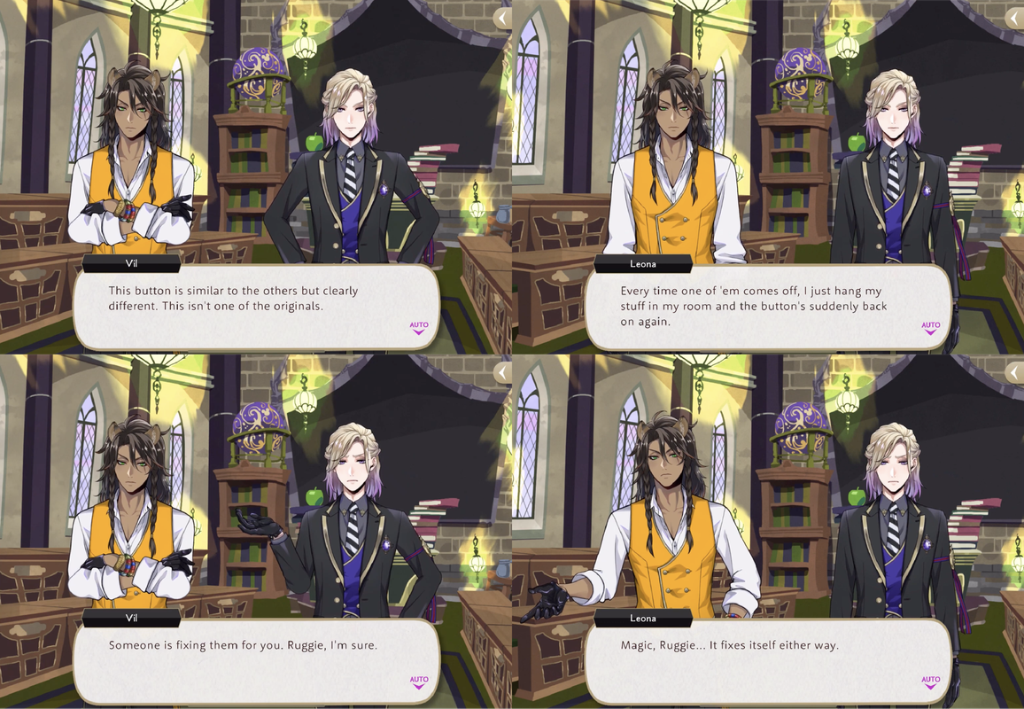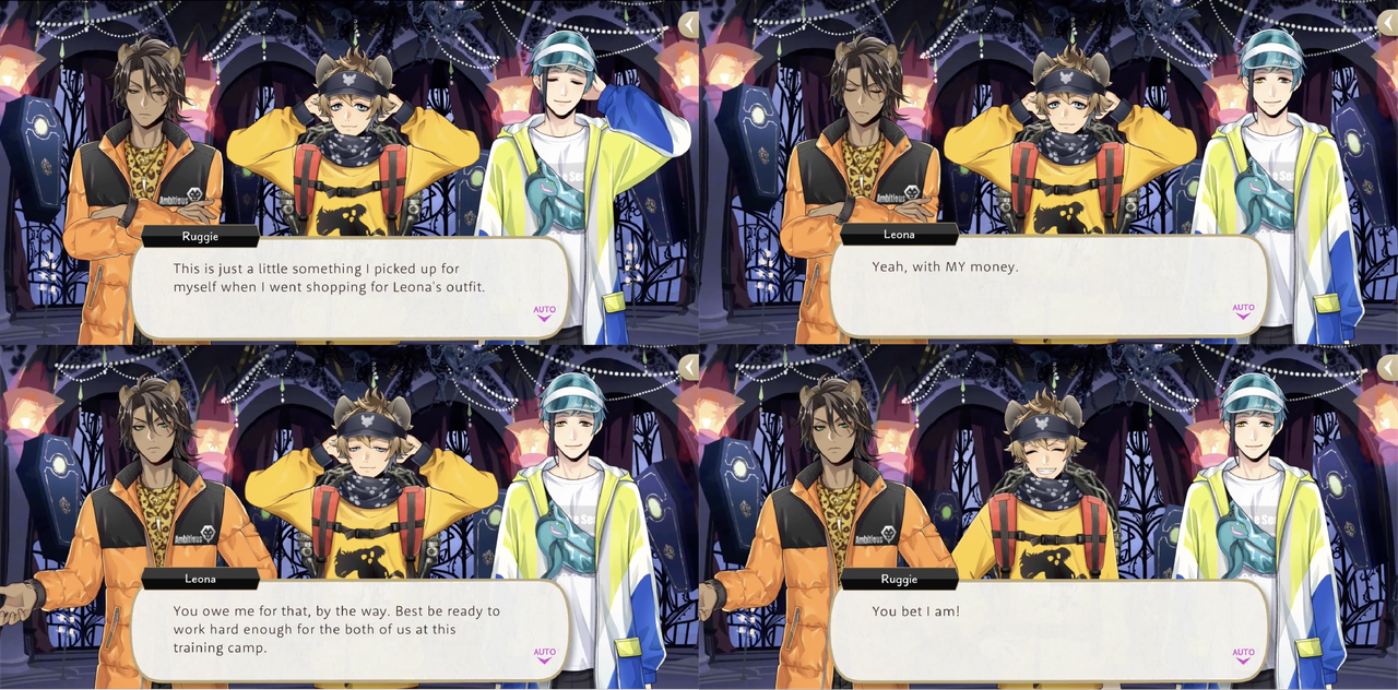 Leona has Ruggie gather potential Spelldrive club members in exchange for doughnuts and compensate him in advance for his efforts during Vargas Camp by buying him a new outfit.