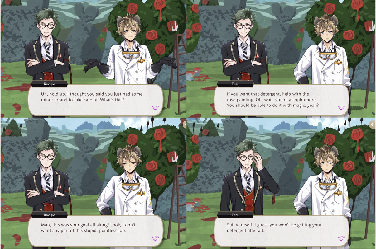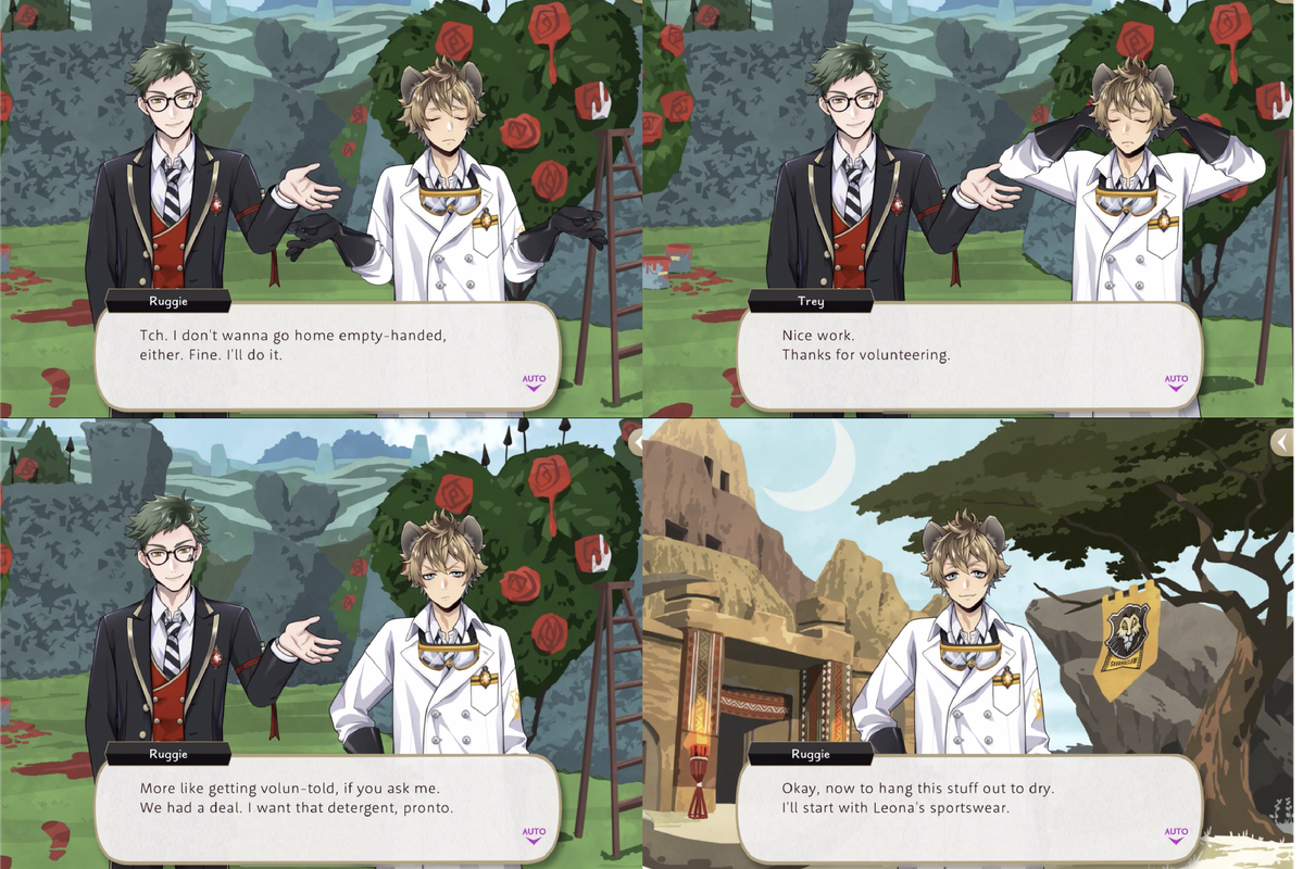 Ruggie spends his labwear vignette trying to do laundry for both himself and Leona, with Trey tricking him into painting roses at Heartslabyul in exchange for laundry detergent.