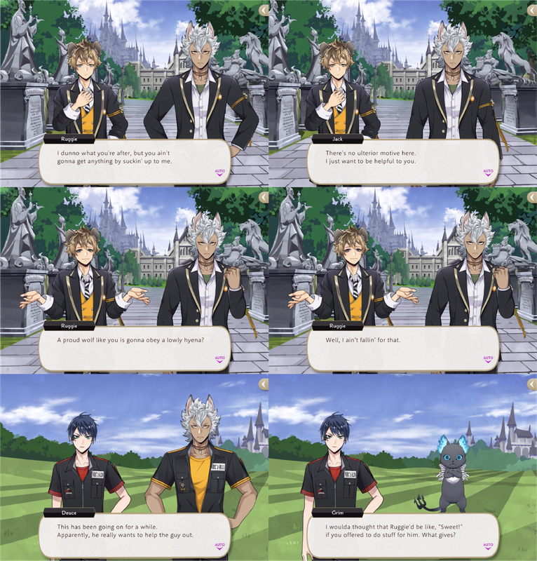 In other vignettes Ruggie seems against accepting services or money for free. This is possibly why Leona cannot hand money or goods over to Ruggie outright and might instead be helping him with his financial problems by having him perform simple tasks, or by giving Ruggie free rein with his wallet and letting Ruggie believe that he is getting away with something underhanded, as otherwise he will not accept the charity.